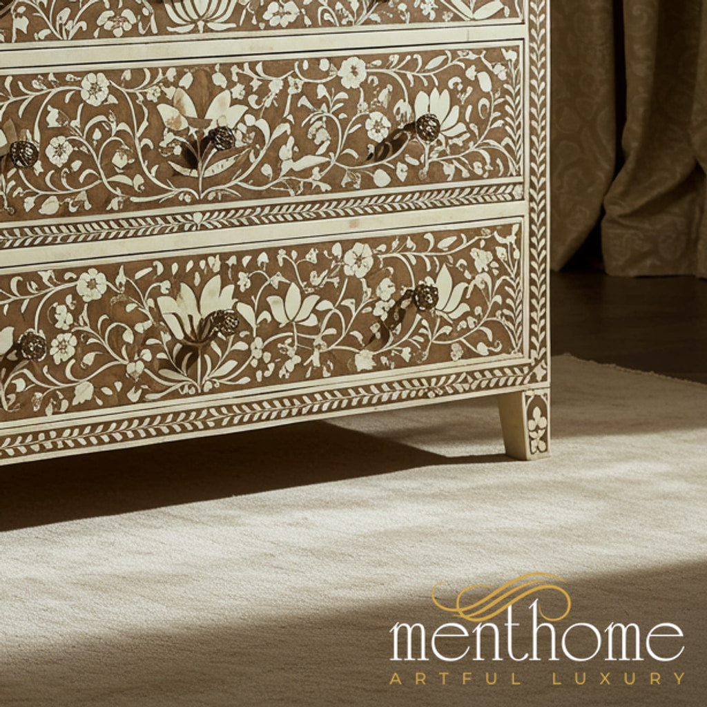Handcrafted Floral Inlay Wooden Dresser | Luxury Handmade Chest of Drawer