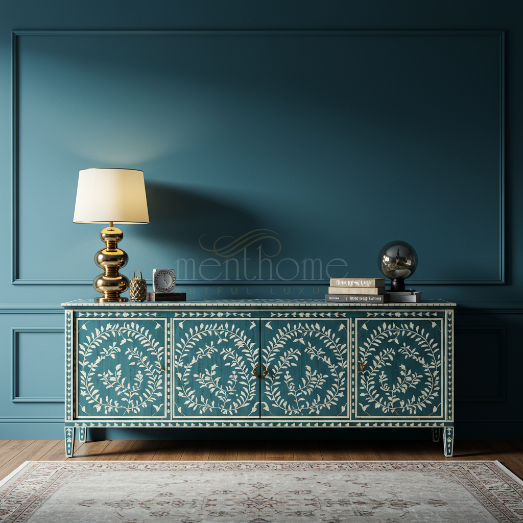 Handcrafted Inlay Blue TV Cabinet with Floral Motif | Luxury Handmade TV Cabinet