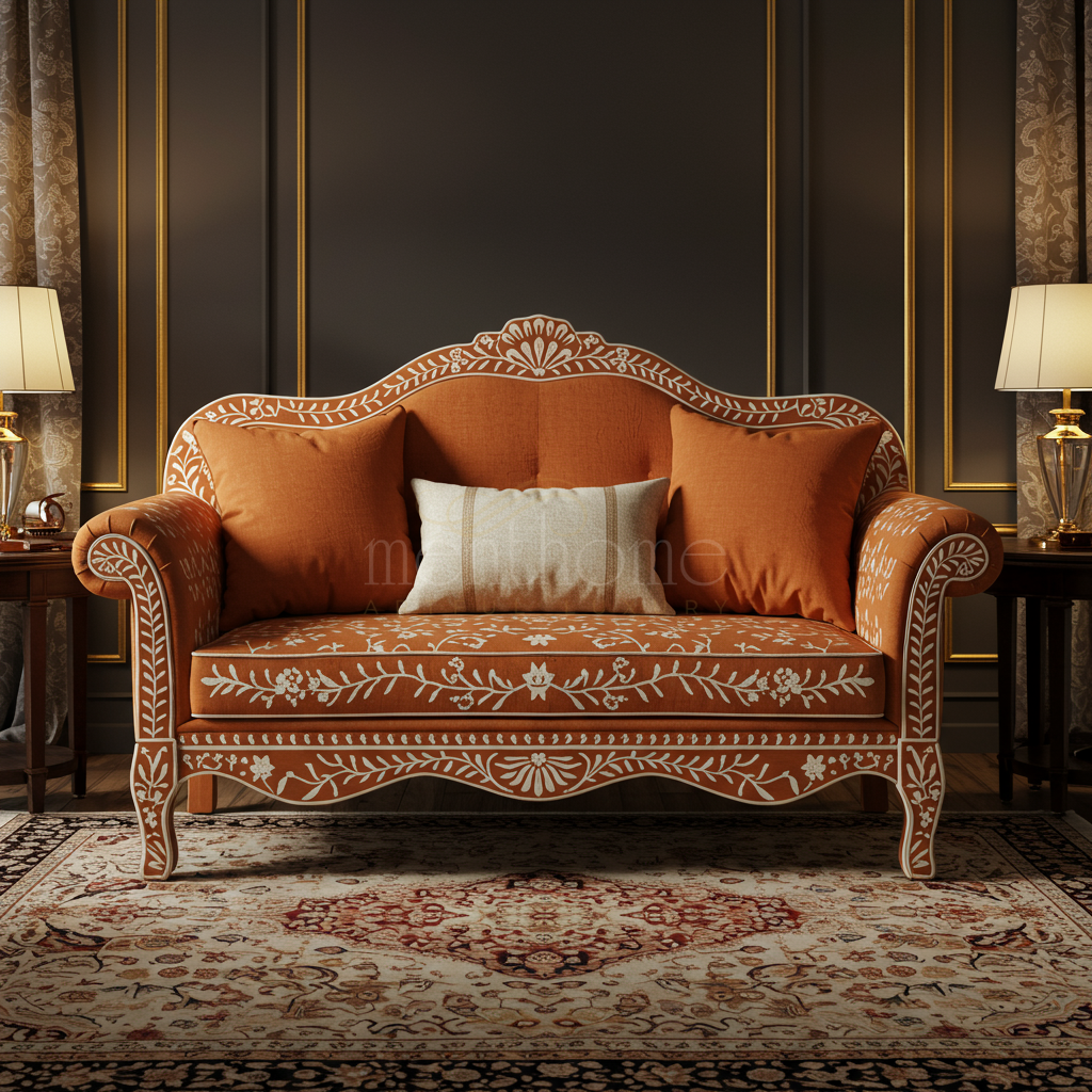Experience the perfect blend of artistry and comfort with this handcrafted inlay floral carved sofa. Featuring intricate white floral patterns on a warm terracotta base, this sofa adds an elegant and timeless charm to any living space. Plush cushions and a sturdy frame ensure both style and durability, making it a centerpiece for luxurious interiors.