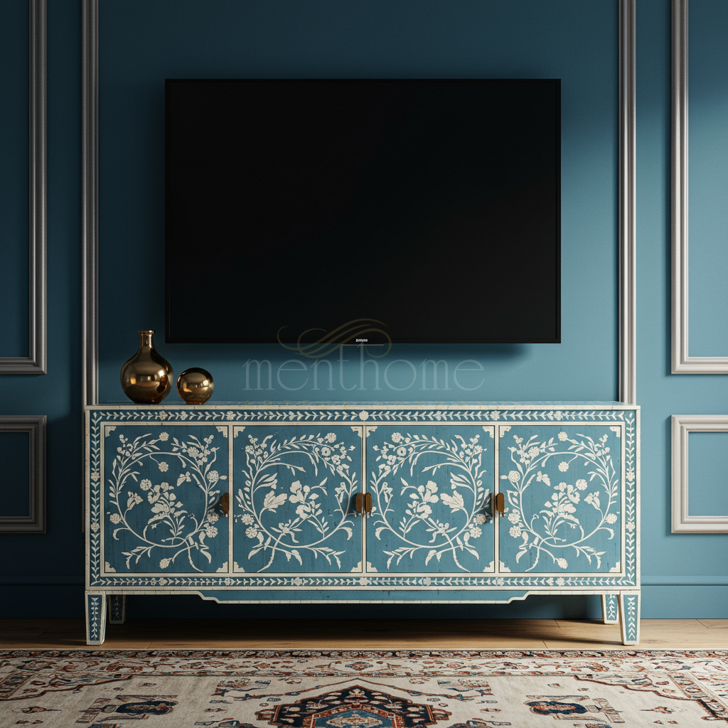 This exquisite TV cabinet showcases intricate hand-painted floral inlay designs on a calming blue backdrop, combining elegance and functionality to elevate any living space. Featuring four doors with brass handles, it offers ample storage while serving as a stunning focal point beneath your television.