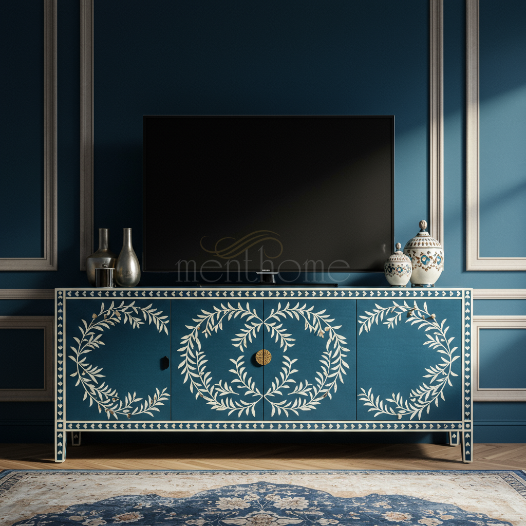 Handcrafted Inlay TV Cabinet in Deep Blue with Floral Motifs | Luxury Handmade TV Cabinet
