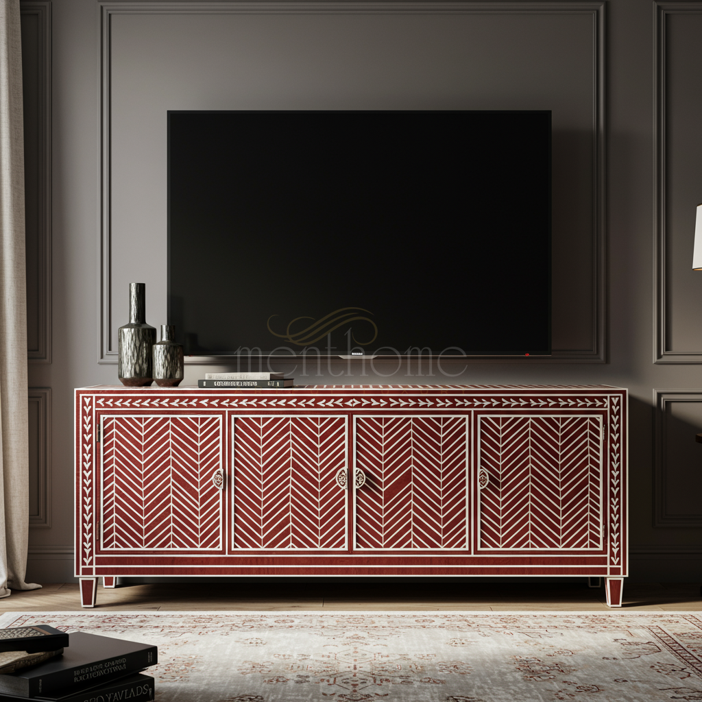 Handcrafted Inlay TV Cabinet with Chevron Pattern | Luxury Handmade TV Cabinet