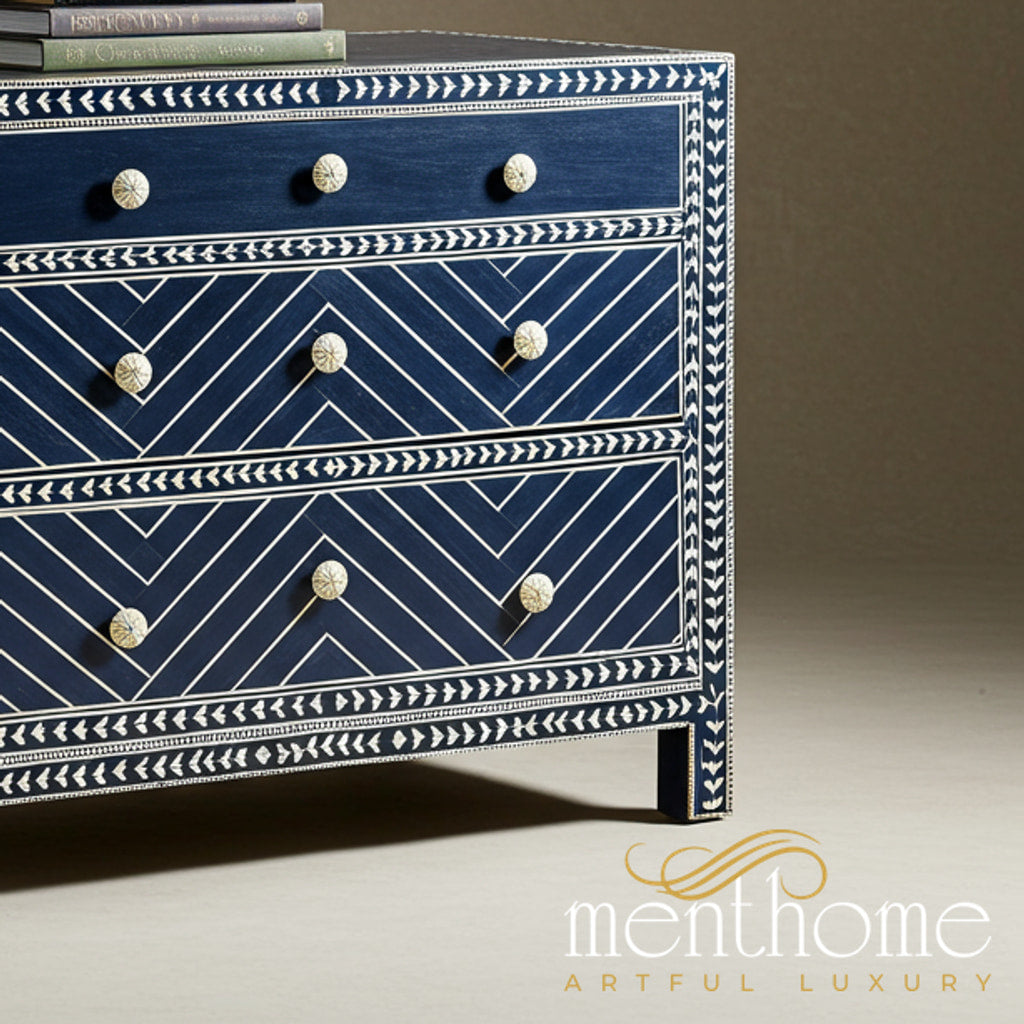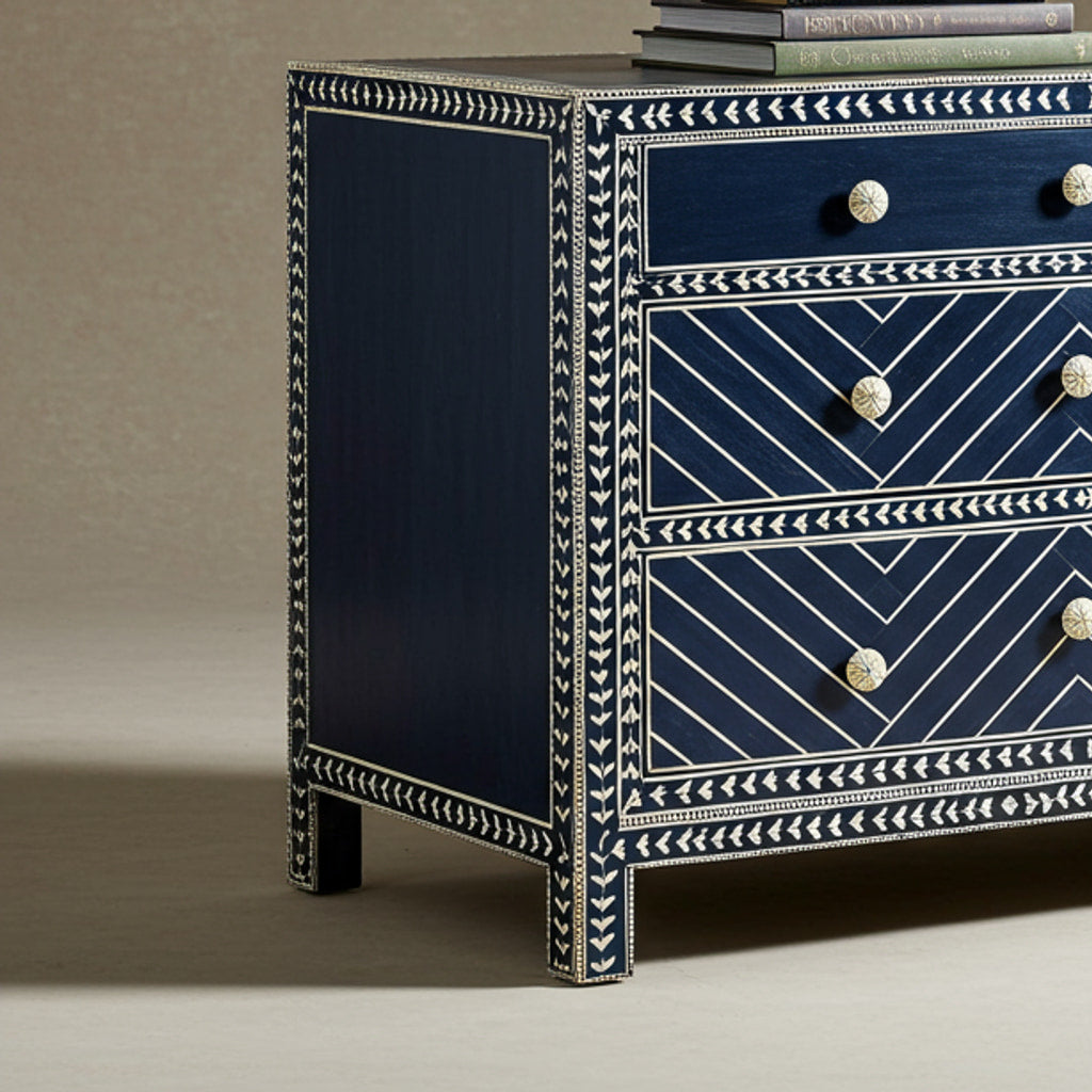 Handcrafted Navy Blue Bone Inlay Chest of Drawers | Luxury Handmade Chest of Drawer