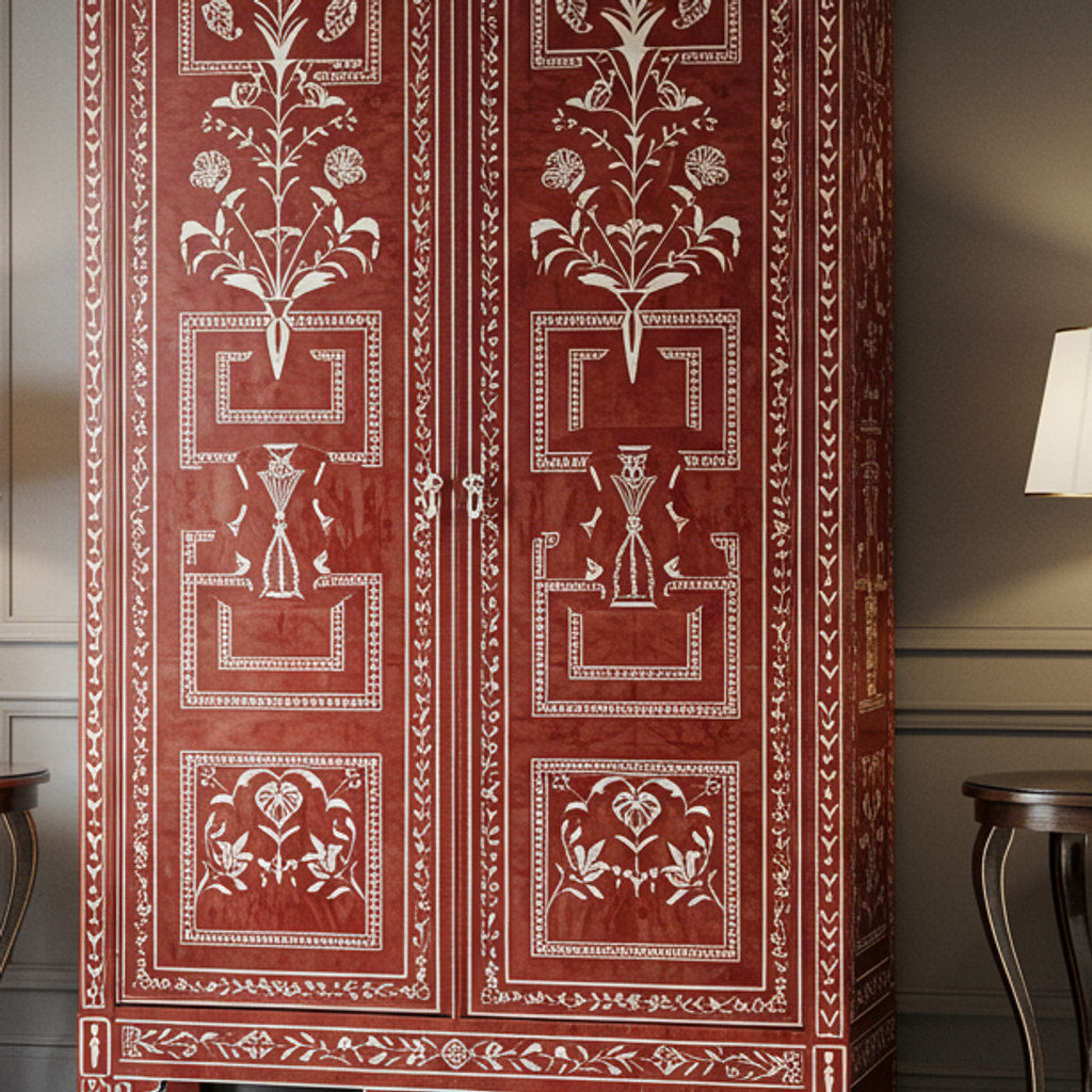 This exquisite wardrobe features a rich red finish adorned with intricate white floral patterns, blending traditional artistry with functional design. Perfect for enhancing bedroom decor while providing ample storage space.