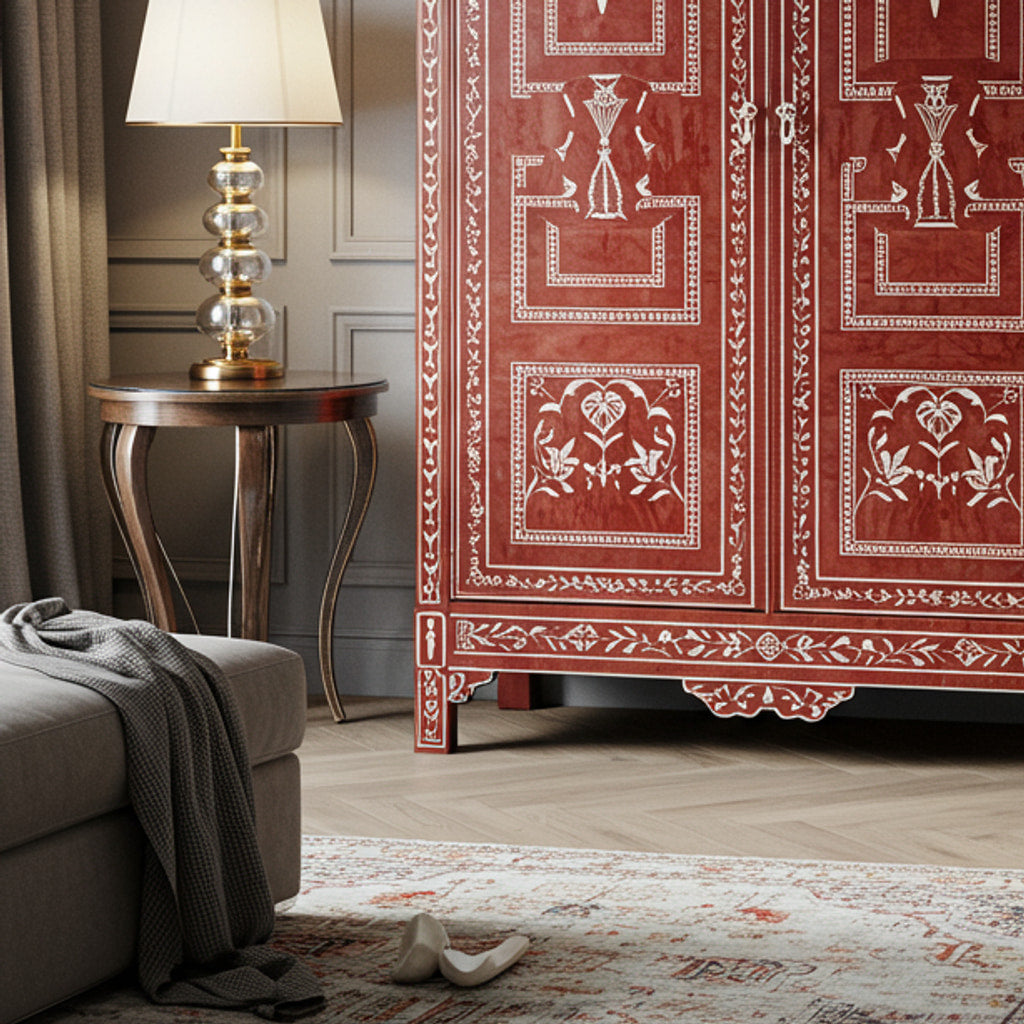 Handcrafted Red Floral Pattern Wooden Wardrobe | Luxury Handmade Wardrobe