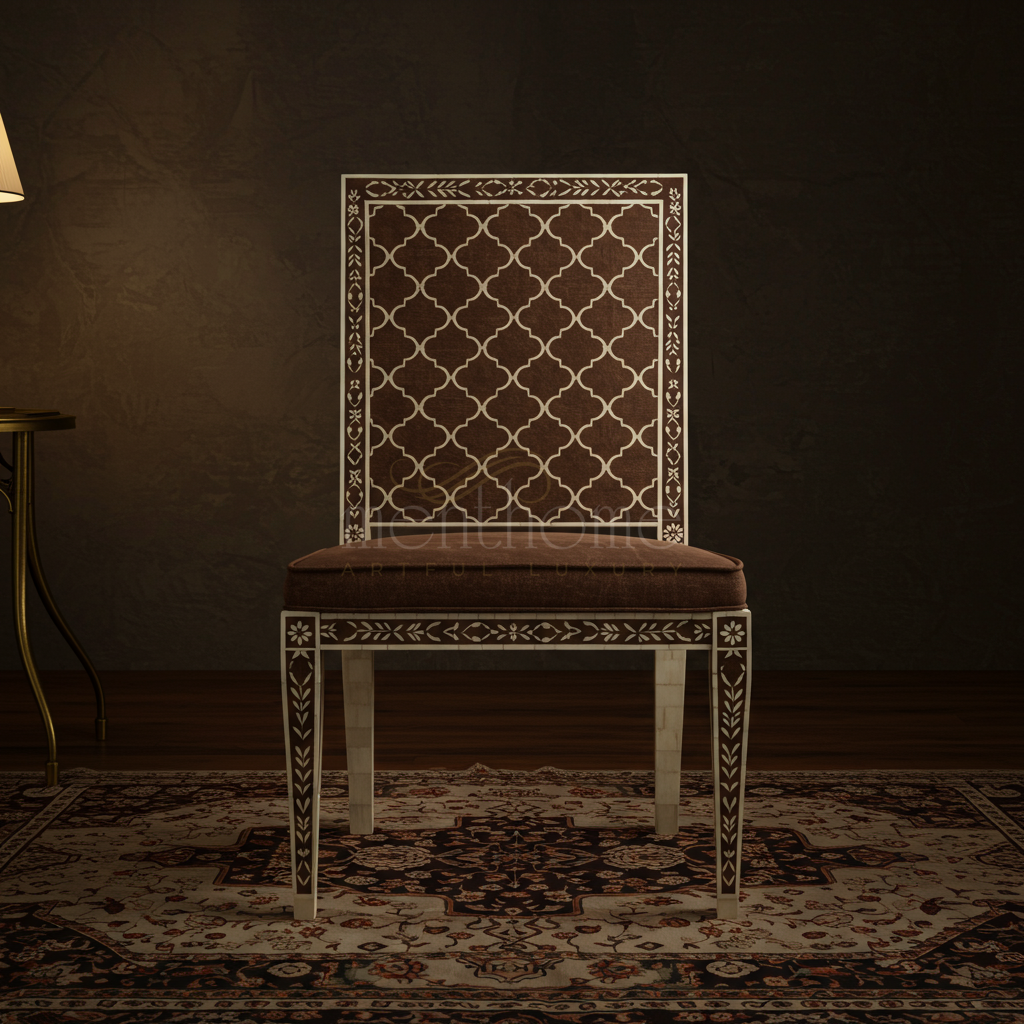 This exquisite Inlay Chair showcases masterful craftsmanship with intricate bone inlay patterns on a rich dark wood frame. The chair features a plush brown cushioned seat that ensures comfort while complementing the detailed geometric and floral inlay designs. Perfectly suited for elevating any elegant dining or sitting area with artisanal charm and timeless luxury.
