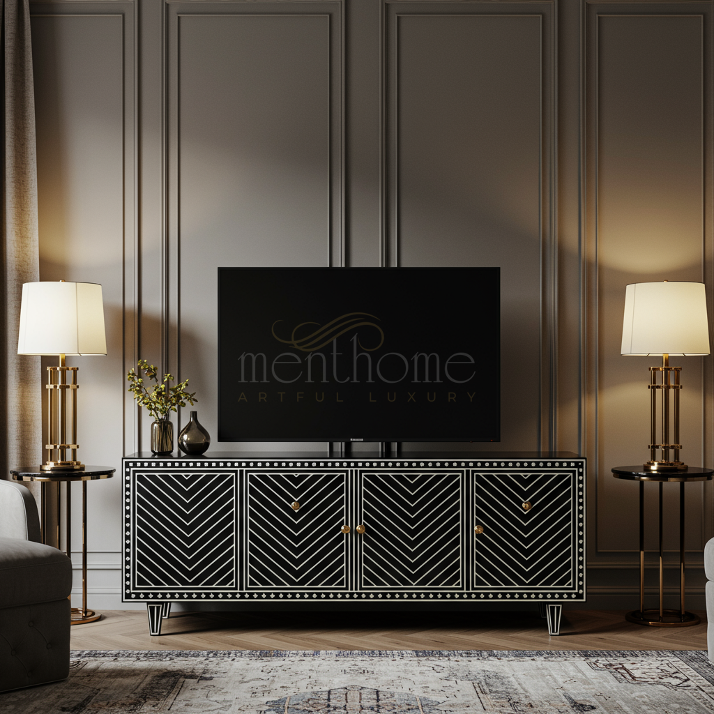 This exquisite TV cabinet features a striking black and white chevron inlay design, blending artisanal craftsmanship with contemporary luxury. Its elegant detailing and gold hardware enhance any living space, providing both functionality and a sophisticated aesthetic.