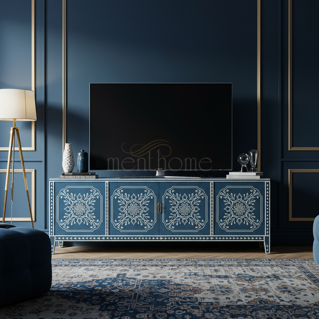 A luxurious and elegantly crafted blue TV cabinet featuring intricate white floral inlay patterns. This statement piece offers ample storage with four doors, perfectly blending traditional craftsmanship with modern home decor.