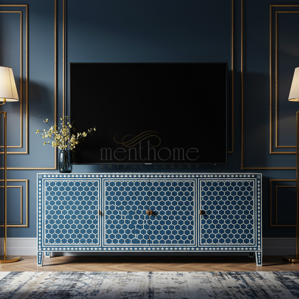 Inlay Blue Geometric Pattern TV Cabinet | Luxury Handmade TV Cabinet