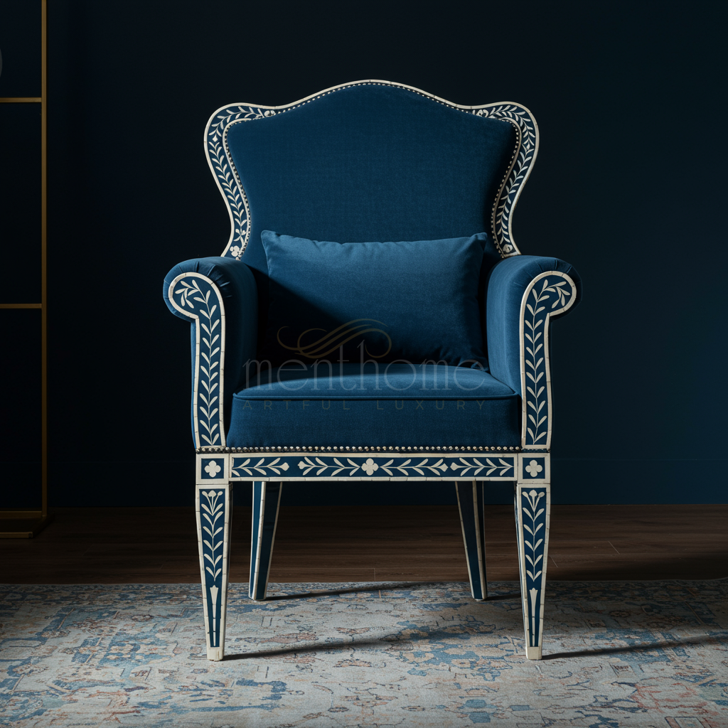 A luxurious blue velvet armchair featuring intricate white inlay designs on the frame and legs. This statement piece combines artful craftsmanship with elegant comfort, perfect for accentuating sophisticated interiors.