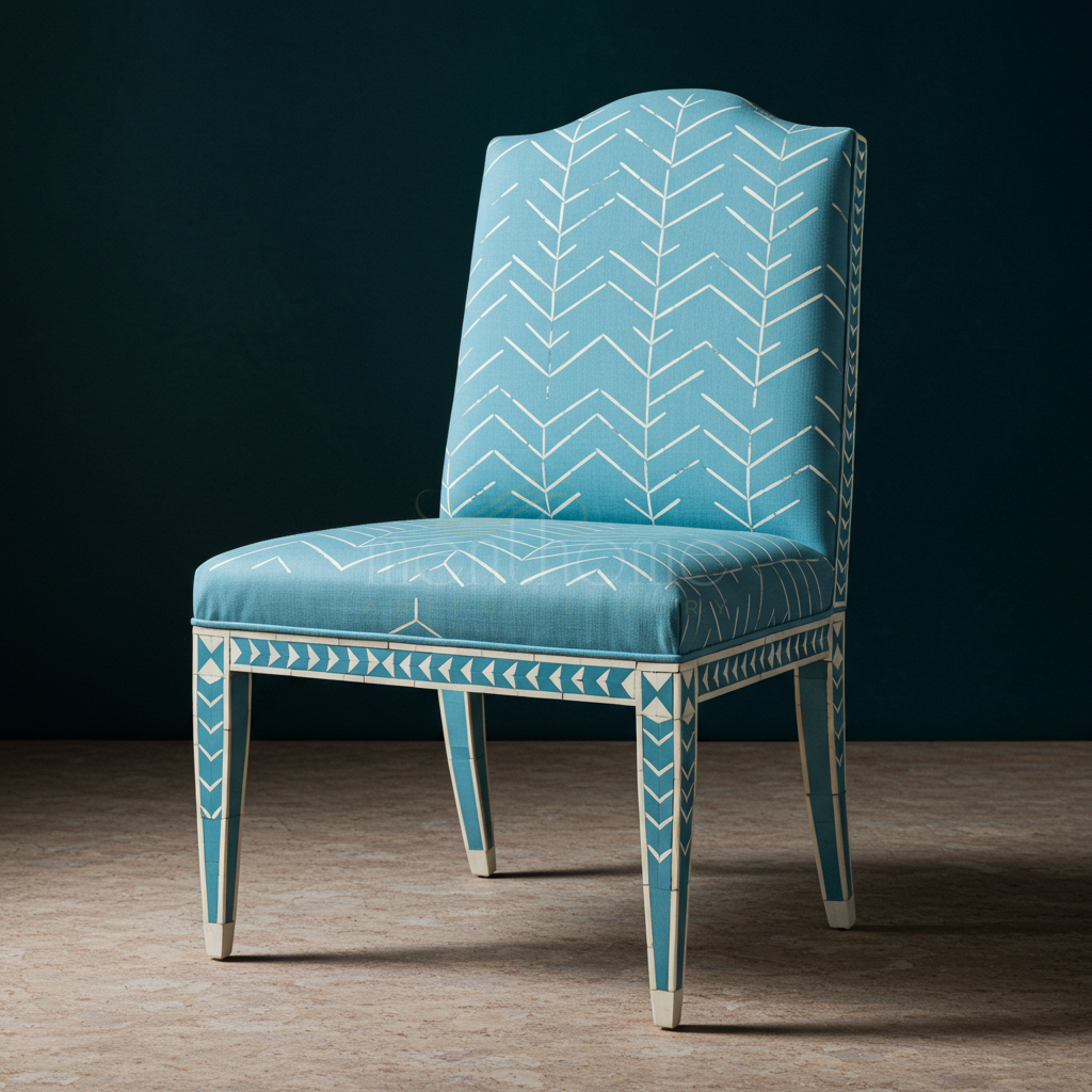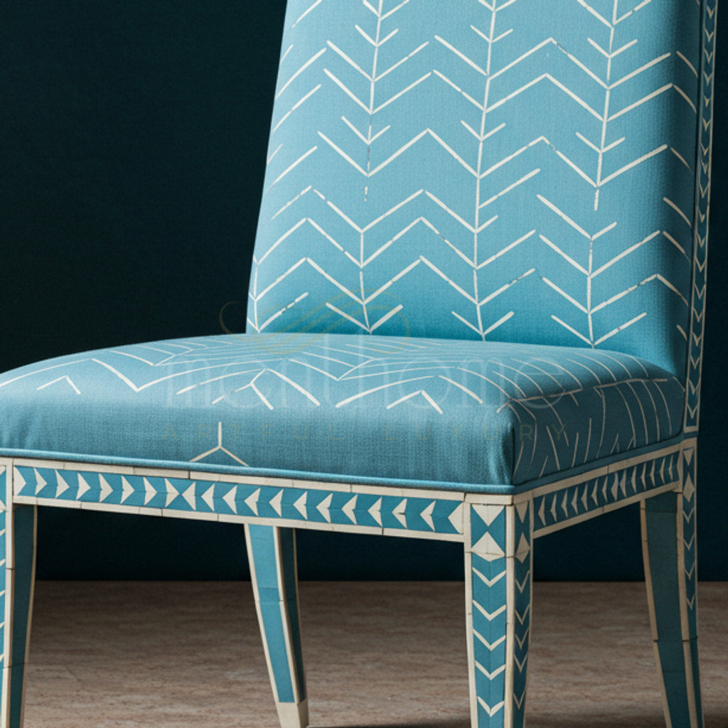 The Inlay Chair features a sophisticated design with geometric inlay patterns complemented by luxurious blue upholstery. This chair brings a refined aesthetic suitable for modern and classic interiors, combining comfort and visual appeal seamlessly.