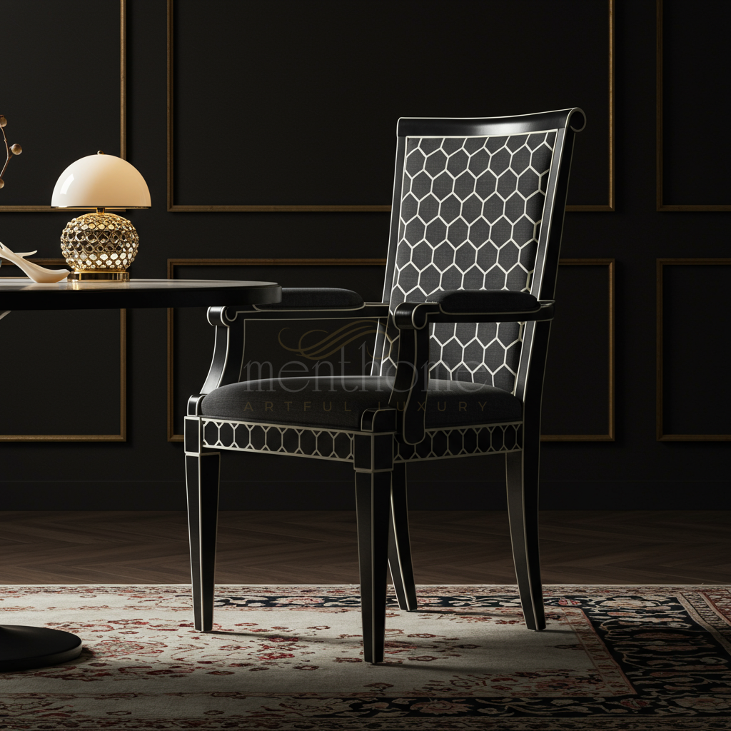 The Inlay Chair is a masterful blend of classic design and modern elegance. Featuring a meticulously crafted wooden frame with intricate inlay details, this chair is upholstered in a sophisticated black fabric with a subtle geometric pattern, offering both aesthetic appeal and comfort. Its high backrest and cushioned armrests provide excellent support, making it an ideal statement piece for dining rooms, offices, or luxurious living spaces.