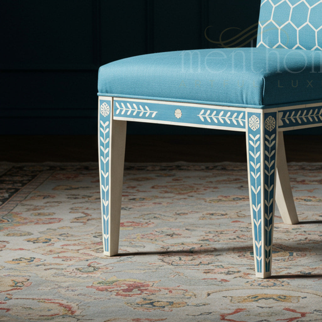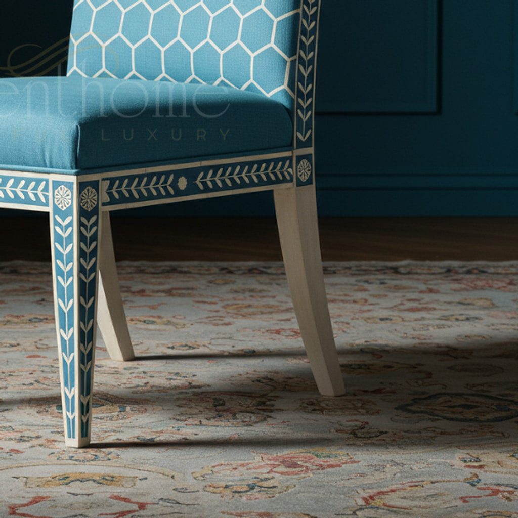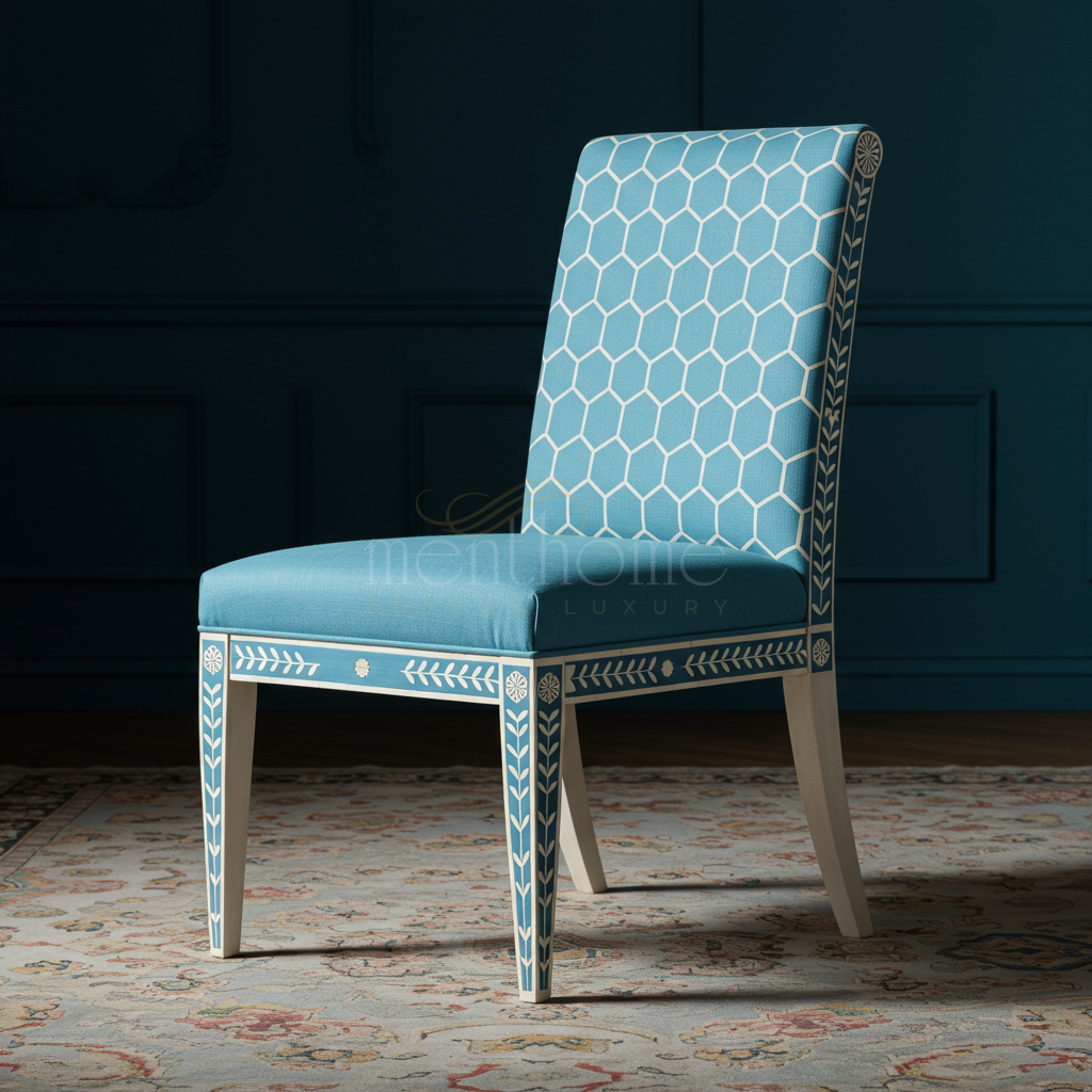 The Inlay Chair is a luxurious seating option that combines intricate hand-painted wood inlay detailing with a modern blue geometric fabric upholstery. Perfectly blending classic craftsmanship with contemporary style, this chair offers both comfort and elegance for upscale interiors.