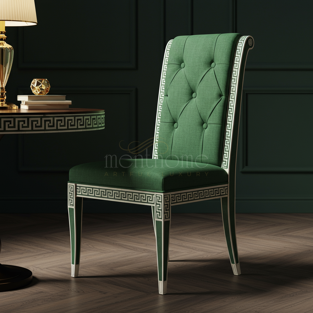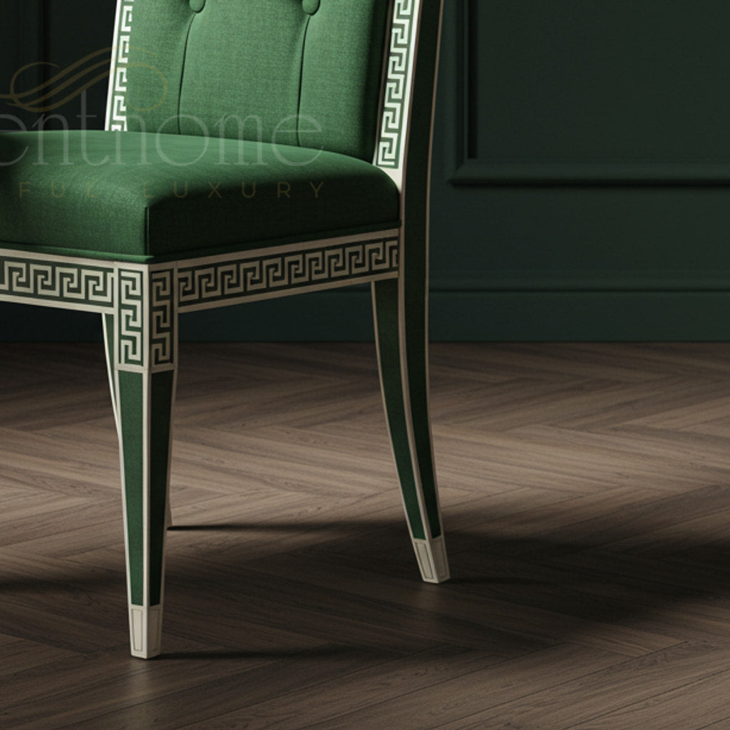 An elegant Inlay Chair featuring lush green upholstery and intricate Greek Key patterned inlays on the wooden frame. Perfectly blending classic design with modern comfort, this chair adds a touch of sophistication and luxury to any dining room or formal setting.