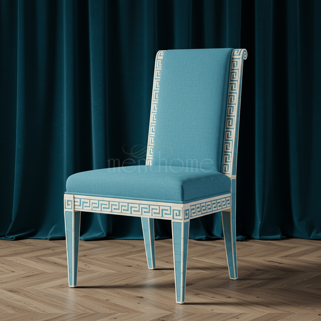 The Inlay Chair showcases impeccable craftsmanship with its elegant Greek key inlay design along the frame and legs, complemented by a plush turquoise upholstered seat and backrest. This chair combines classical motifs with a modern silhouette, perfect for elevating any luxury interior setting.