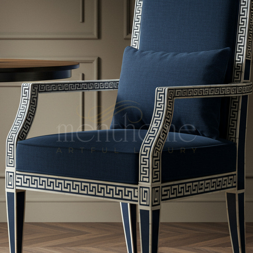 Experience refined elegance with the Inlay Chair, featuring a sophisticated navy blue upholstery complemented by intricate Greek key pattern inlay. Crafted for both comfort and style, this chair offers a plush cushioned seat and backrest, supported by a finely detailed frame, making it a statement piece for luxury living spaces.