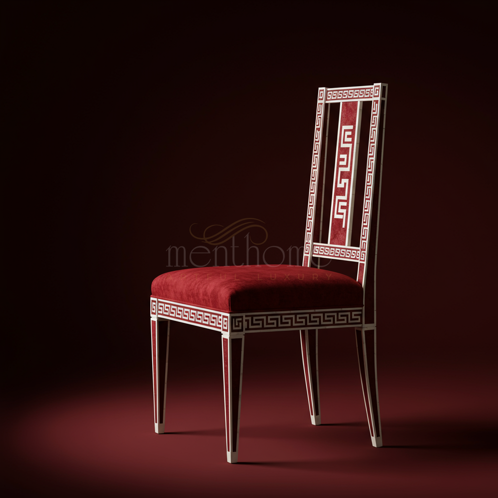 A sophisticated Inlay Chair featuring rich red velvet upholstery paired with intricate white geometric inlay detailing on the frame and legs. This chair embodies refined elegance and is designed to elevate both traditional and modern interiors with its distinctive artistic craftsmanship.