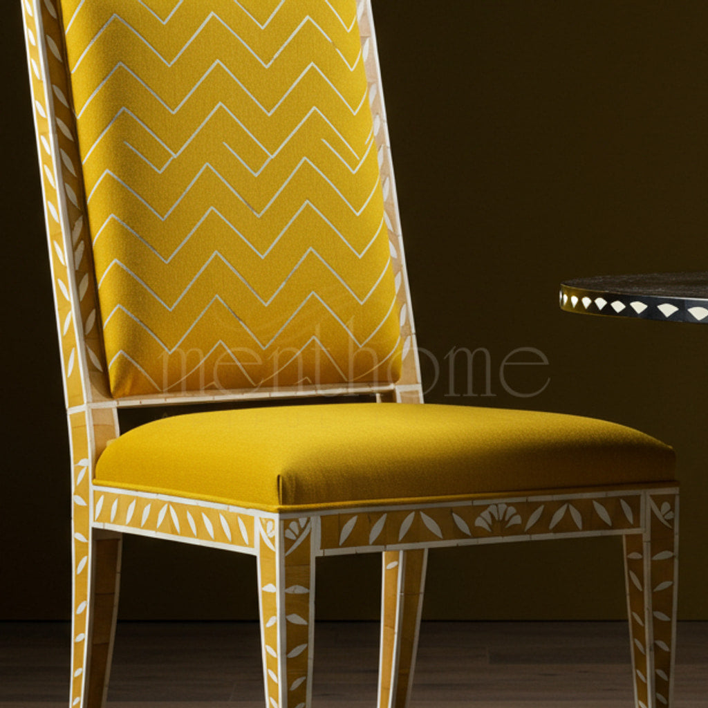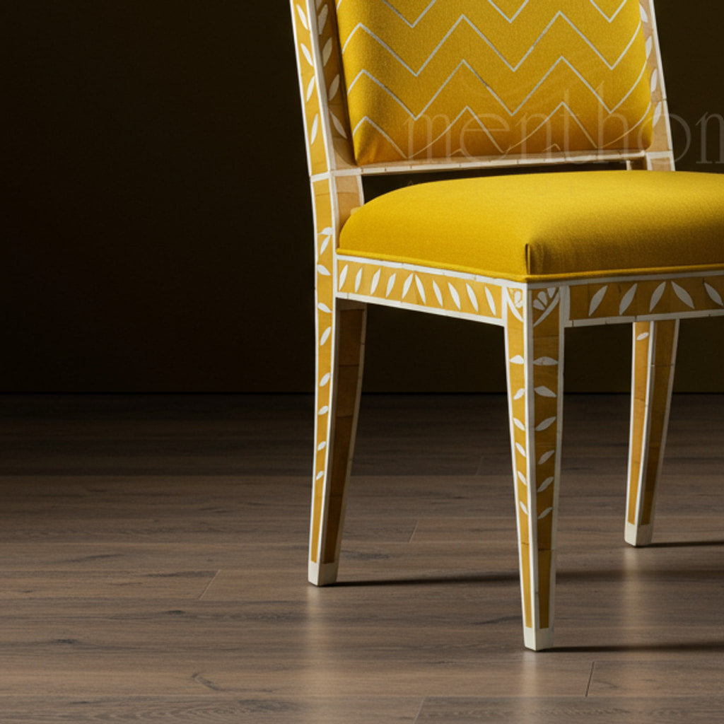 Elegant and meticulously crafted, this Inlay Chair features intricate bone inlay detailing on a wooden frame paired with vibrant yellow upholstered cushions. Its stylish design offers both comfort and sophistication, perfect for adding a luxurious touch to any dining or living space.