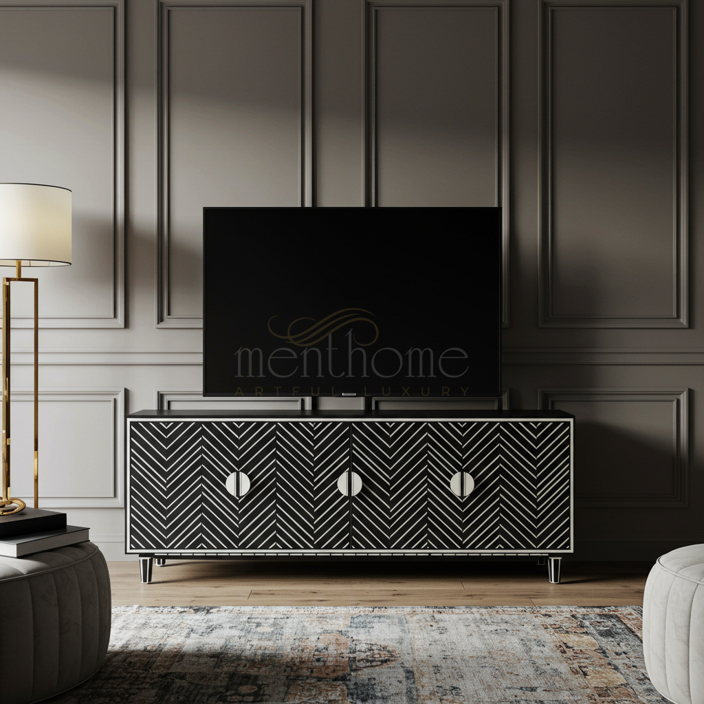 A luxurious and contemporary TV cabinet featuring a striking black and white chevron inlay design. This piece is handcrafted to bring a bold visual statement to your living room while providing ample storage space for electronics and media accessories.
