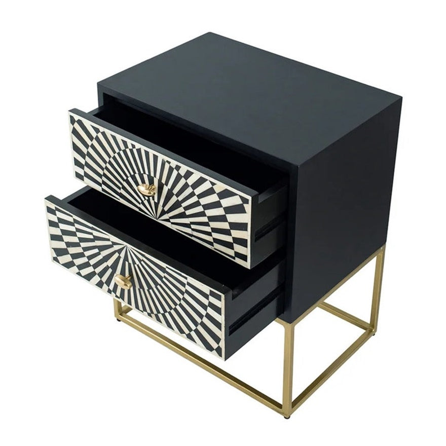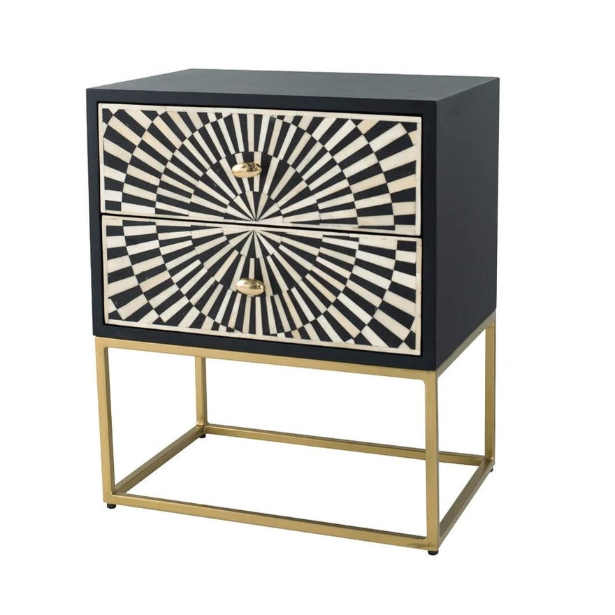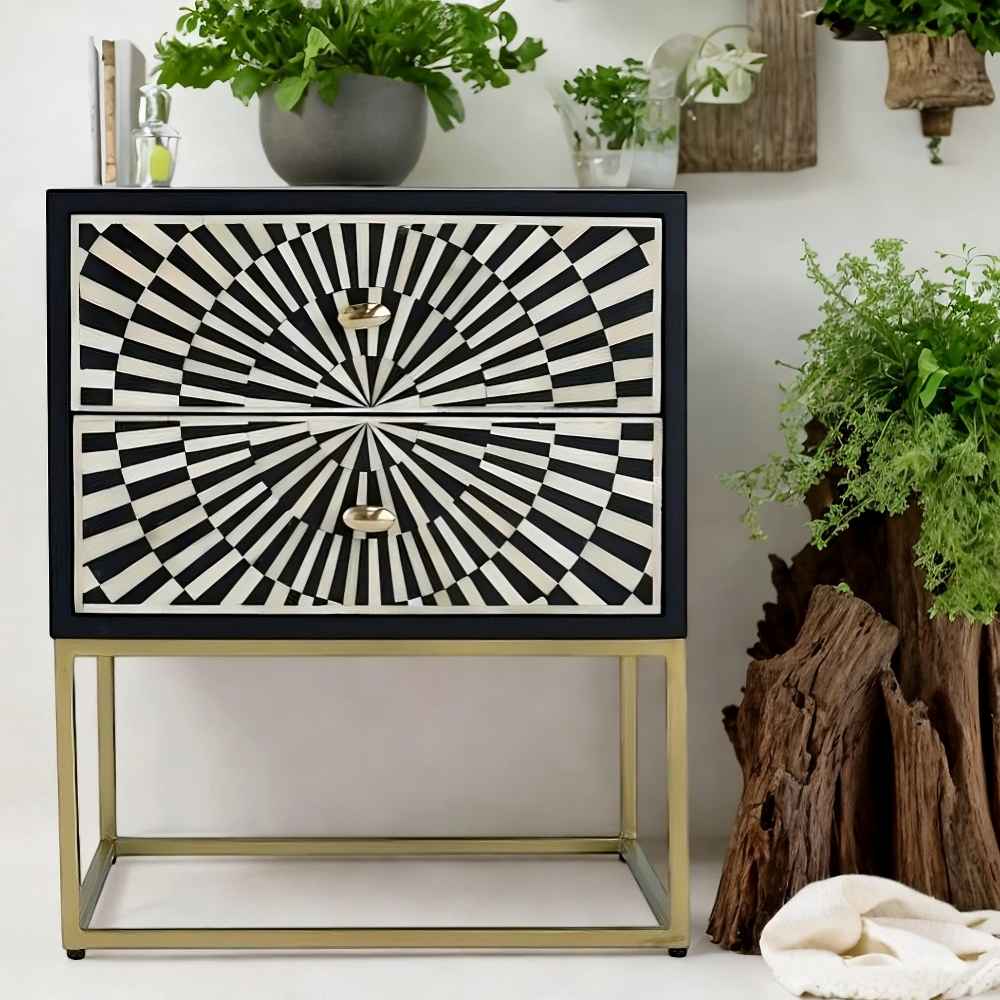 Unique and one of a kind, this small, bone-inlay Indian Modern Handmade Bone Inlay Sideboard is inlaid with fragments of mirrored glass. Each plexiglass chip is hand-cut with special glass-cutting scissors and laid out by skilled craftsmen in these Rangoli patterns. The effect as you walk past this chest is to see a shimmer of repeating reflections. If you become the proud owner of this hand-crafted inlaid Chevron Table, you could also order another glass inlaid item in the same color using our bespoke order service. Keep the room’s accessories minimal to emphasize the statement piece's rich beauty. \n \nBRAND: Menthome \n \nART-TYPE: Wooden Furniture \n \nMATERIAL: MDF, Bone, Resin, and Iron \n \nDIMENSIONS: (L * W * H) = (32  x 17 x 48) Inch \n \nWEIGHT: 80 Kg \n \nCOLOR: Black \n \nPACKAGE CONTENT: 1 x Bone Inlay Sideboard \n \nDelivery Time: Within 30-45 Working Days \n \nNote: \n
