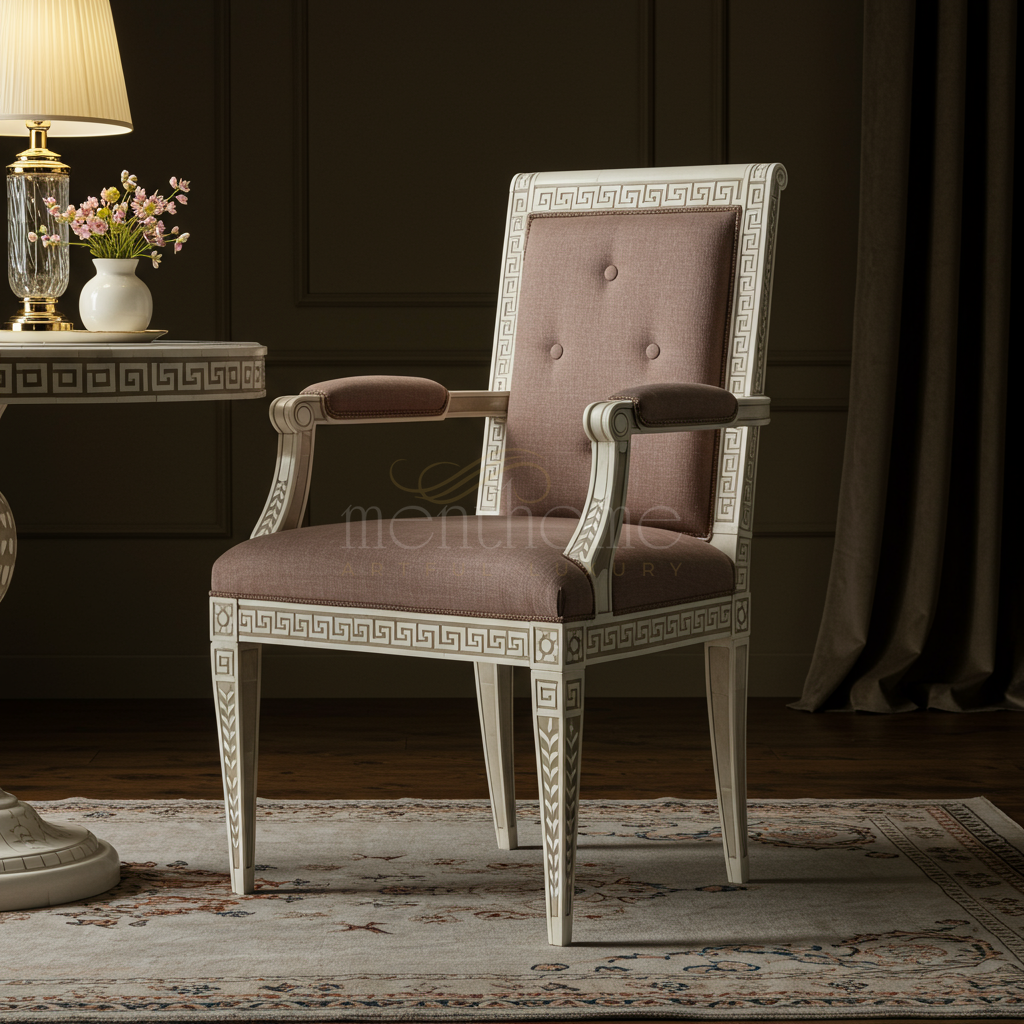 Exquisitely crafted Inlay Chair featuring elegant Greek key motifs with fine detailing on a classic white wood frame. Upholstered in a muted mauve fabric with button tufting, the chair combines traditional craftsmanship with sophisticated design, perfect for luxurious interiors.