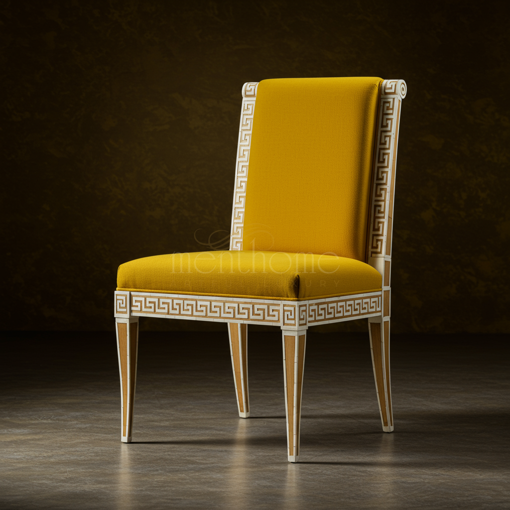 A luxurious dining chair featuring a vibrant yellow upholstered seat and backrest, complemented by an intricate Greek key inlay pattern on a light wooden frame, perfect for adding elegance and color to any dining or living space.