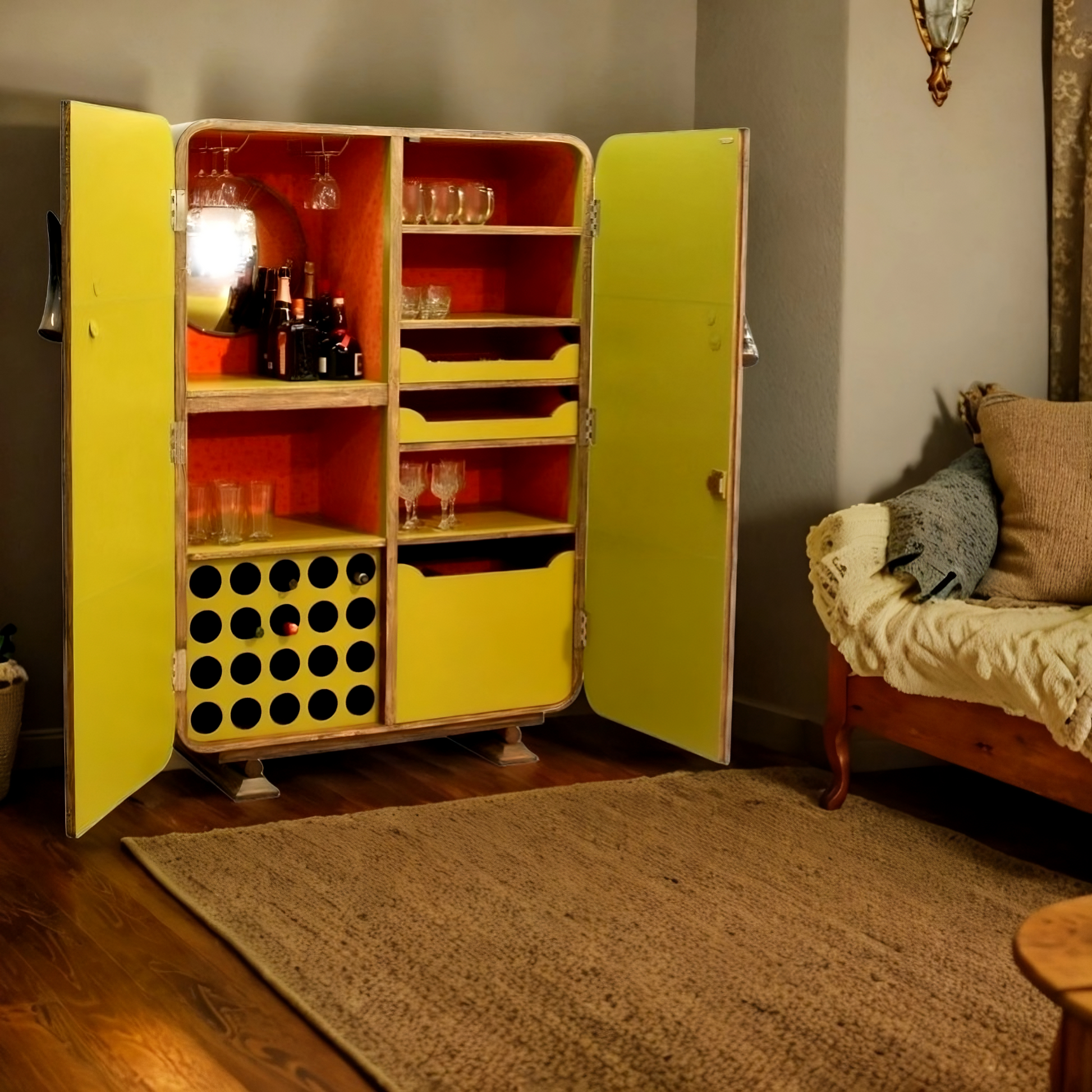 \n \nBRAND: Menthome \n \nART-TYPE: Wooden Furniture \n \nMATERIAL: Hand-stained Leather and Suede \n \nDIMENSIONS: (L * W * H) = (48 x 20 x 69.25) inches \n \nCOLOR: Grey, Yellow \n \nPACKAGE CONTENT: 1 x Leather Bar Cabinet \n \nDelivery Time: Within 30-45 Working Days \n \nNote: \n