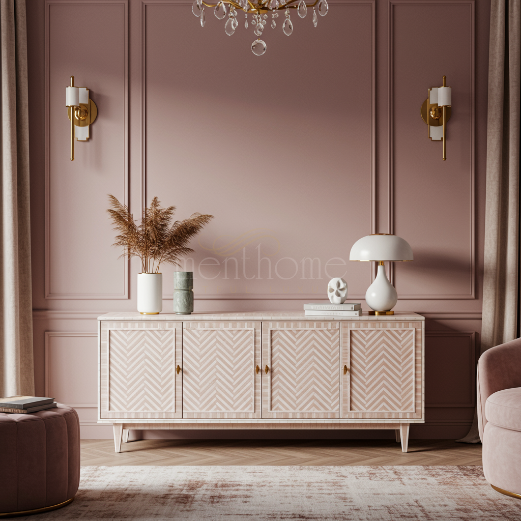 This exquisite inlay TV cabinet showcases a refined chevron pattern crafted from high-quality wood. With four spacious doors, it offers ample storage while enhancing any living space with its elegant and sophisticated design. The cabinet's light pastel finish, paired with subtle gold accents on the handles, makes it an ideal centerpiece for modern luxury interiors.