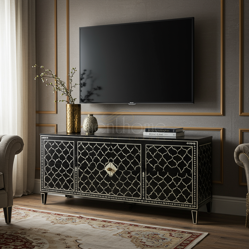 Luxury Black Inlay TV Cabinet with Intricate White Pattern | Luxury Handmade TV Cabinet