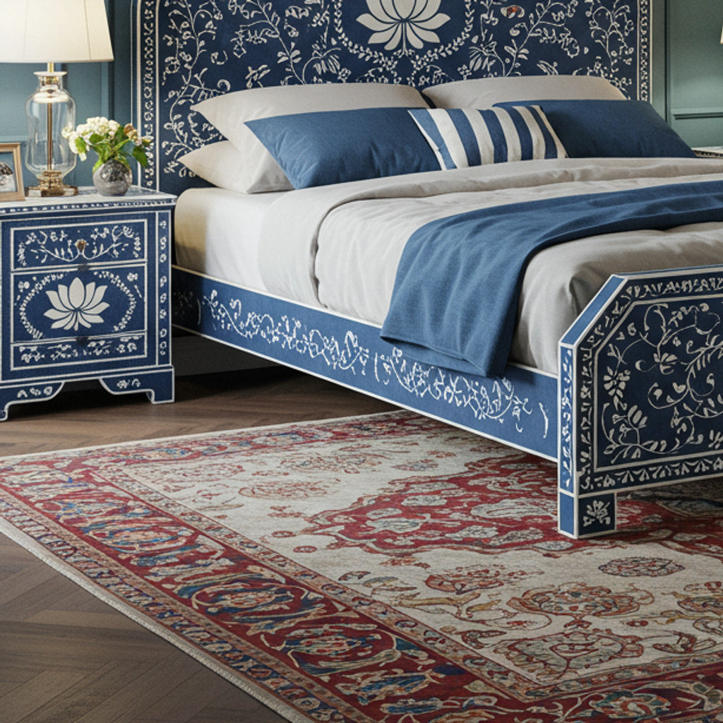 Luxury Blue Floral Inlay King Size Bed with Matching Nightstands