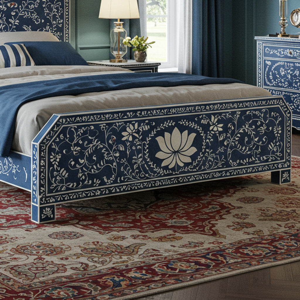 Elevate your bedroom décor with this exquisite luxury king size bed featuring intricate white floral inlay designs on a rich blue finish. Paired with matching nightstands showcasing the same craftsmanship, this set offers both elegance and functionality, perfect for creating a sophisticated and serene bedroom atmosphere.