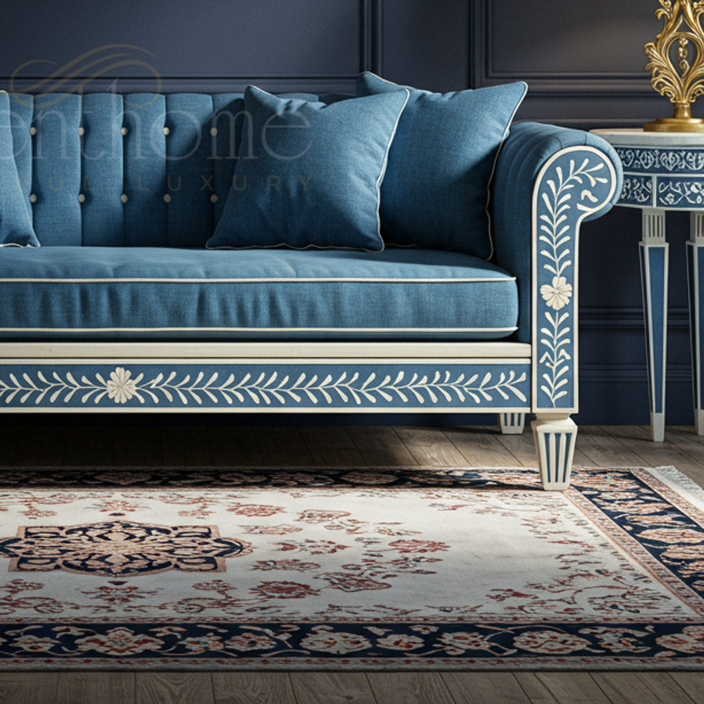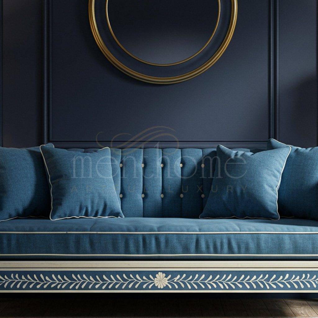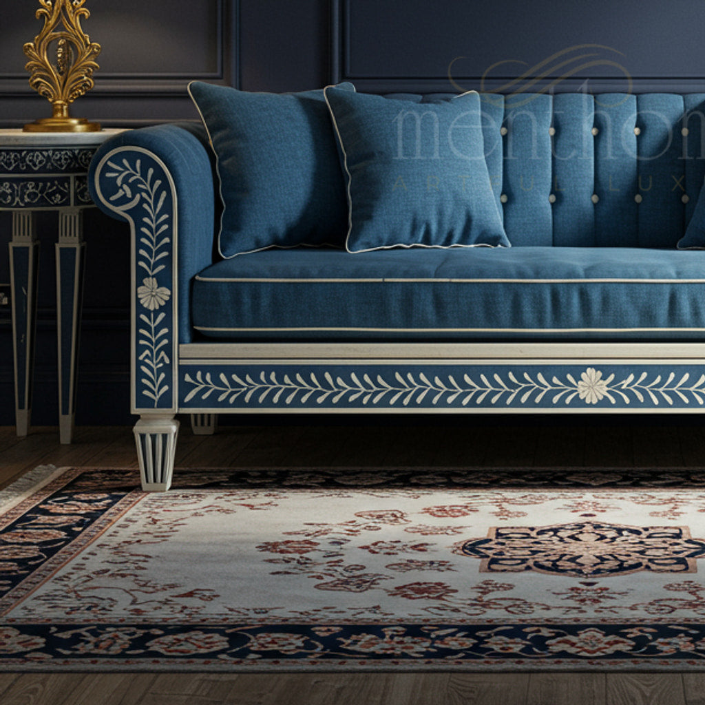 This exquisite luxury sofa features a rich blue upholstery complemented by intricate white floral inlay patterns on its frame and armrests. Crafted to elevate any living space, it combines timeless elegance with comfort, accentuated by the tufted backrest and plush cushions. Perfect for sophisticated interiors, this piece is a statement of refined taste and artisanal craftsmanship.