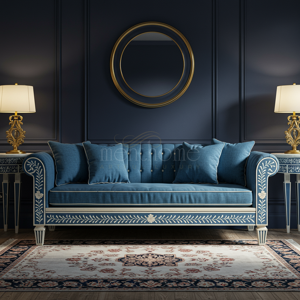 Luxury Blue Inlay Sofa with Elaborate Floral Detailing | Luxury Handmade Sofa
