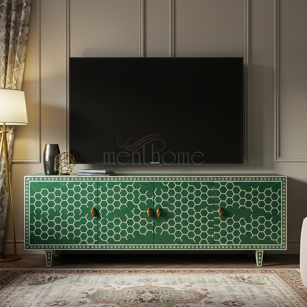 Luxury Green Inlay TV Cabinet with Geometric Pattern | Luxury Handmade TV Cabinet