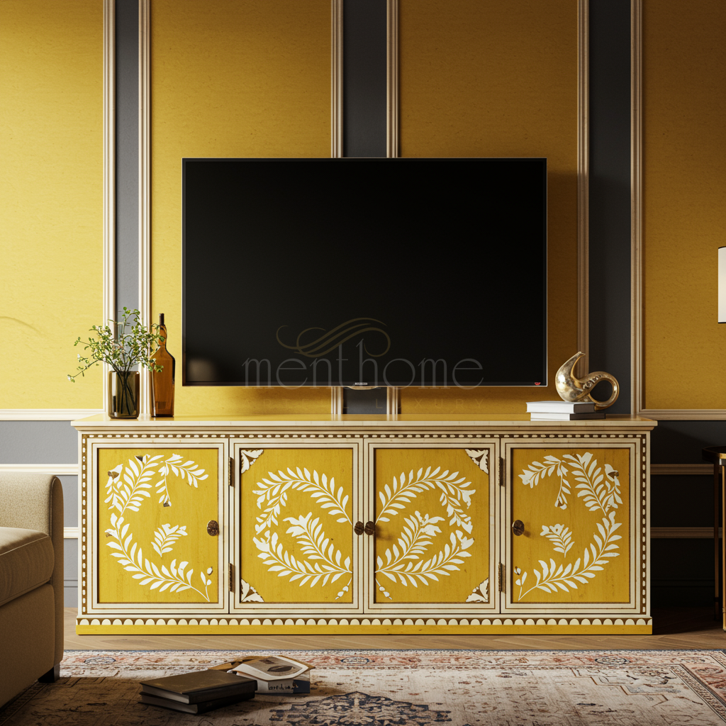 This exquisite TV cabinet showcases a handcrafted inlay design featuring elegant white floral patterns on a vibrant mustard yellow base. Perfectly blending traditional craftsmanship with contemporary style, this cabinet offers ample storage with four intricately decorated doors. Ideal for enhancing the aesthetic of any living room, it combines functionality and artistry in a unique piece of luxury furniture.