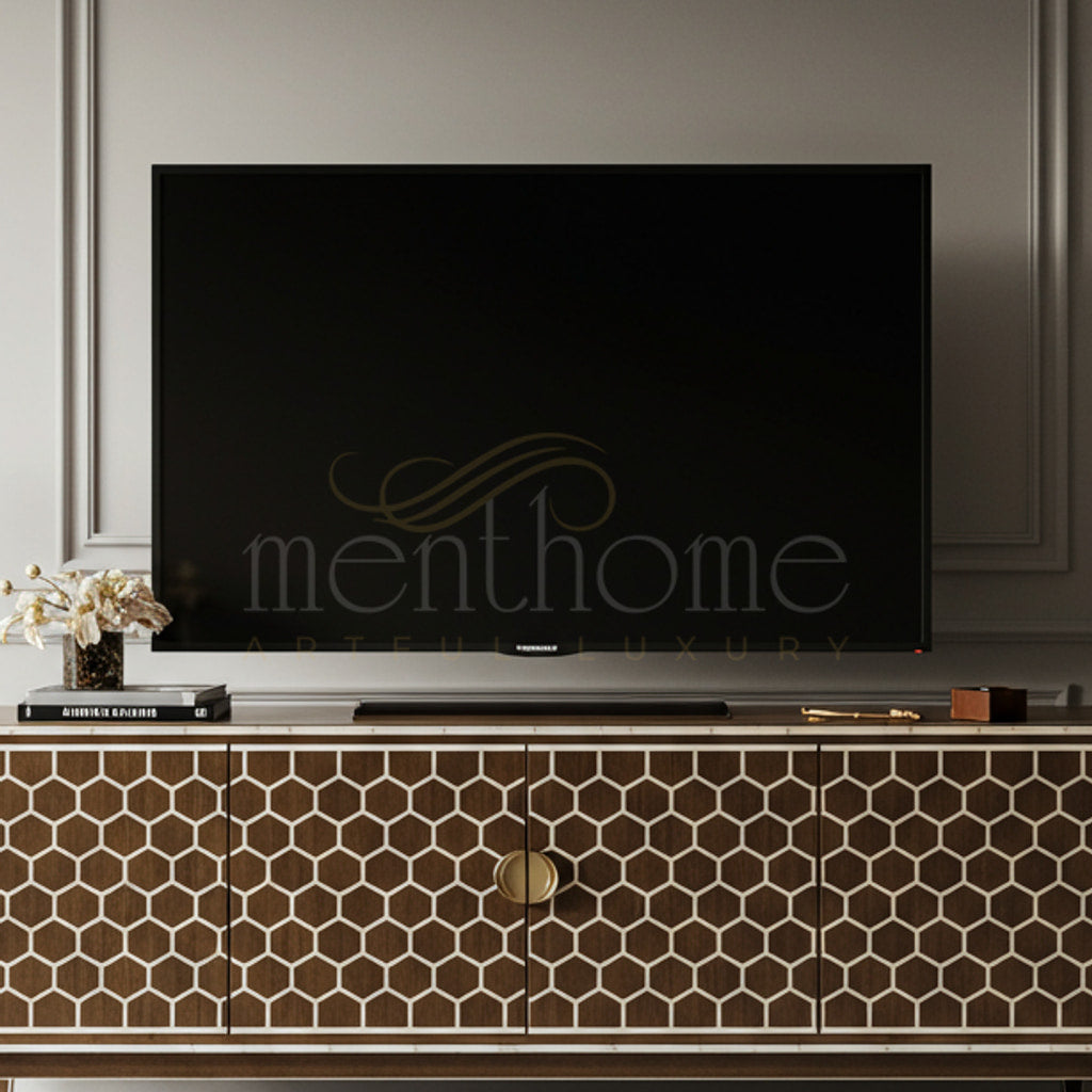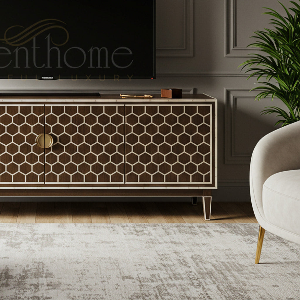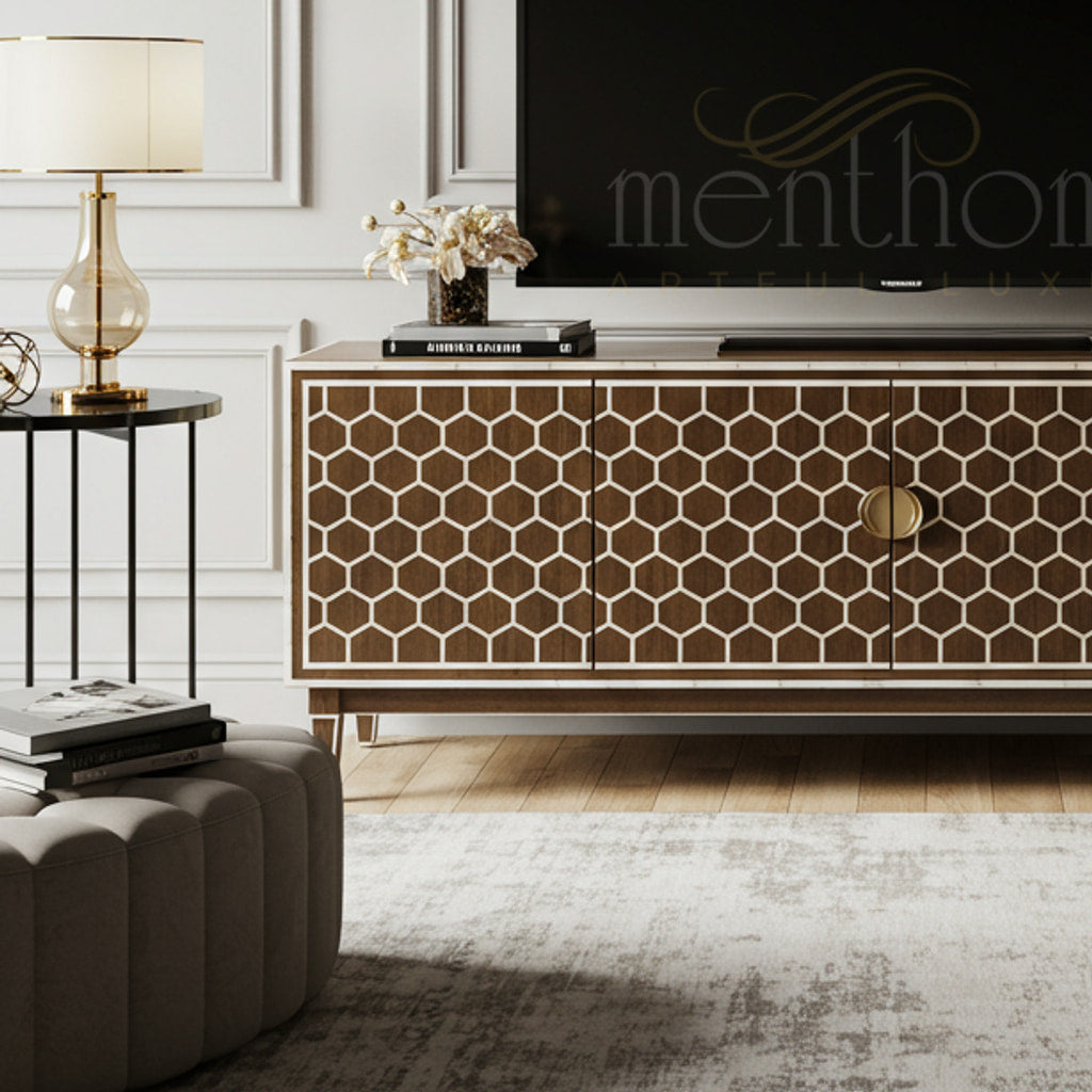 This exquisite TV cabinet features a sophisticated hexagon inlay design on rich wooden surfaces, complemented by a sleek frame and elegant gold accents. Crafted to elevate any living space, it combines functionality with high-end aesthetics, providing ample storage and a chic base for your entertainment setup.