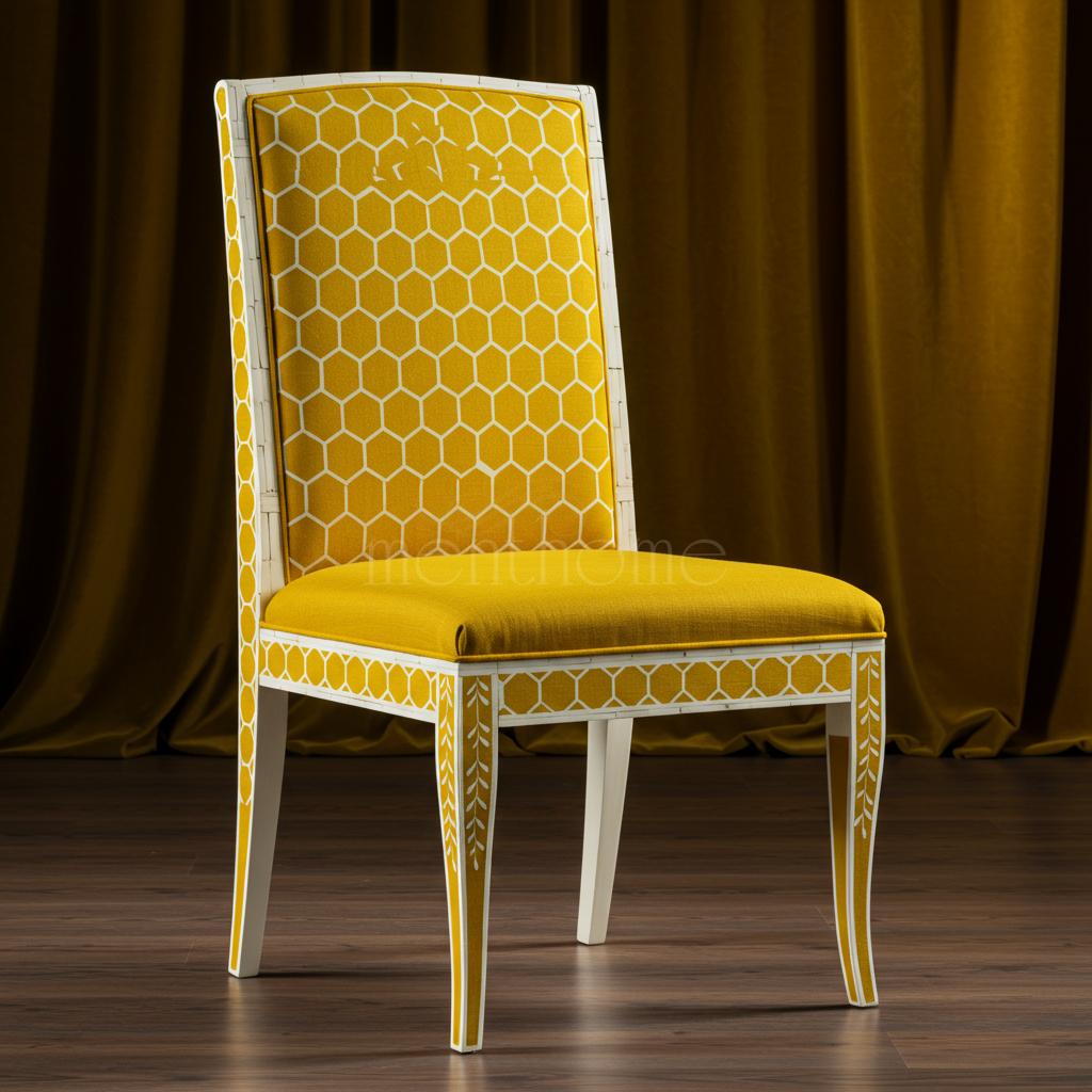 This exquisite Inlay Chair features a sophisticated honeycomb hexagon pattern in mustard yellow upholstery paired with a white inlaid wooden frame. Designed to blend contemporary style with classic craftsmanship, it adds a vibrant yet elegant touch to any dining or lounge setting.
