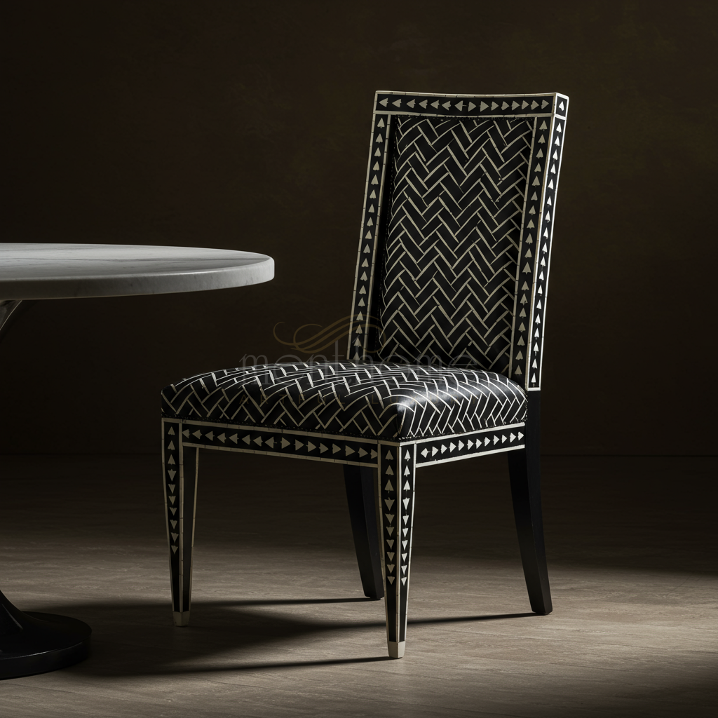 This exquisite Inlay Chair features an intricate black and ivory geometric pattern with carefully crafted inlay details. Designed for both comfort and style, this chair adds a sophisticated and artistic touch to any dining or living space. Its sleek silhouette and fine craftsmanship make it a statement piece in luxury furniture.