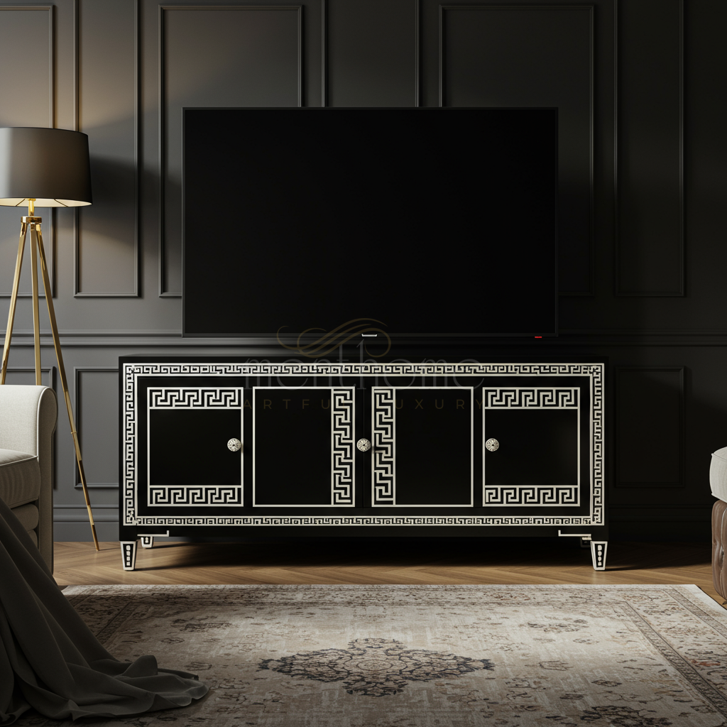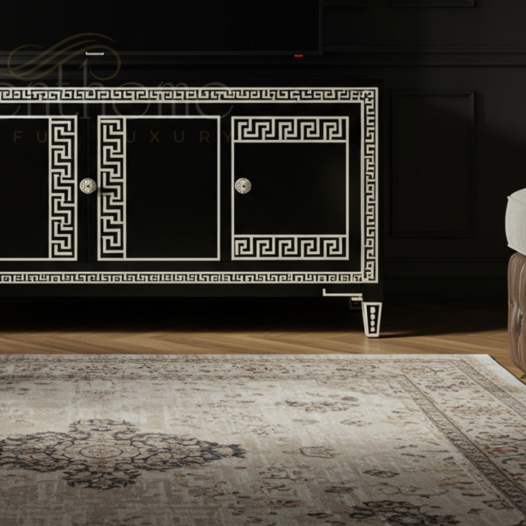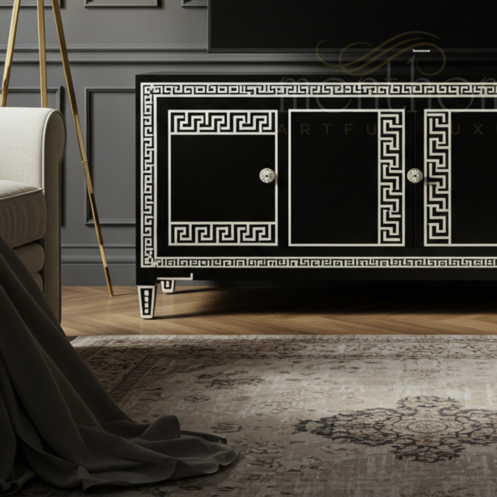 This exquisite luxury TV cabinet features a striking black finish with elegant white Greek key patterned inlay, providing both functional storage and a sophisticated statement piece for any living room. Crafted with precise detailing, it offers ample space for media devices while seamlessly complementing contemporary and classic interiors.