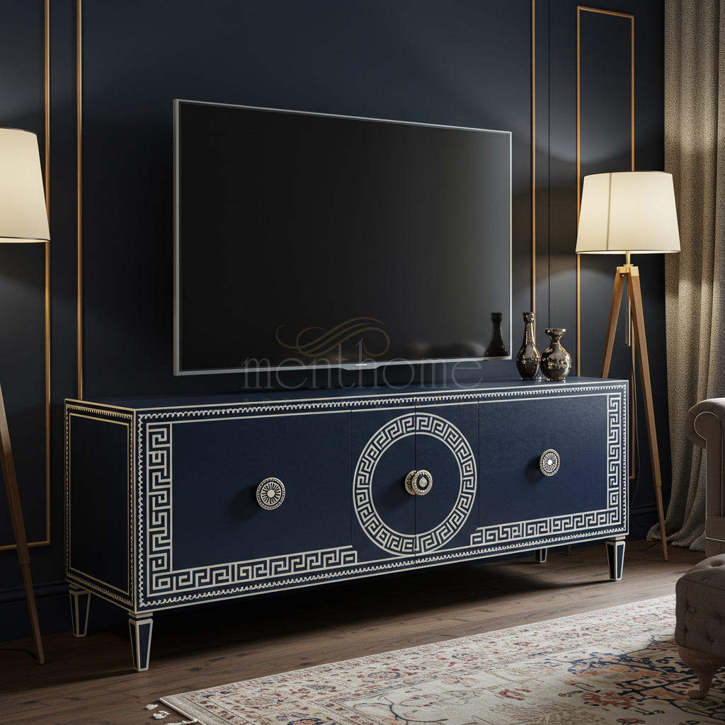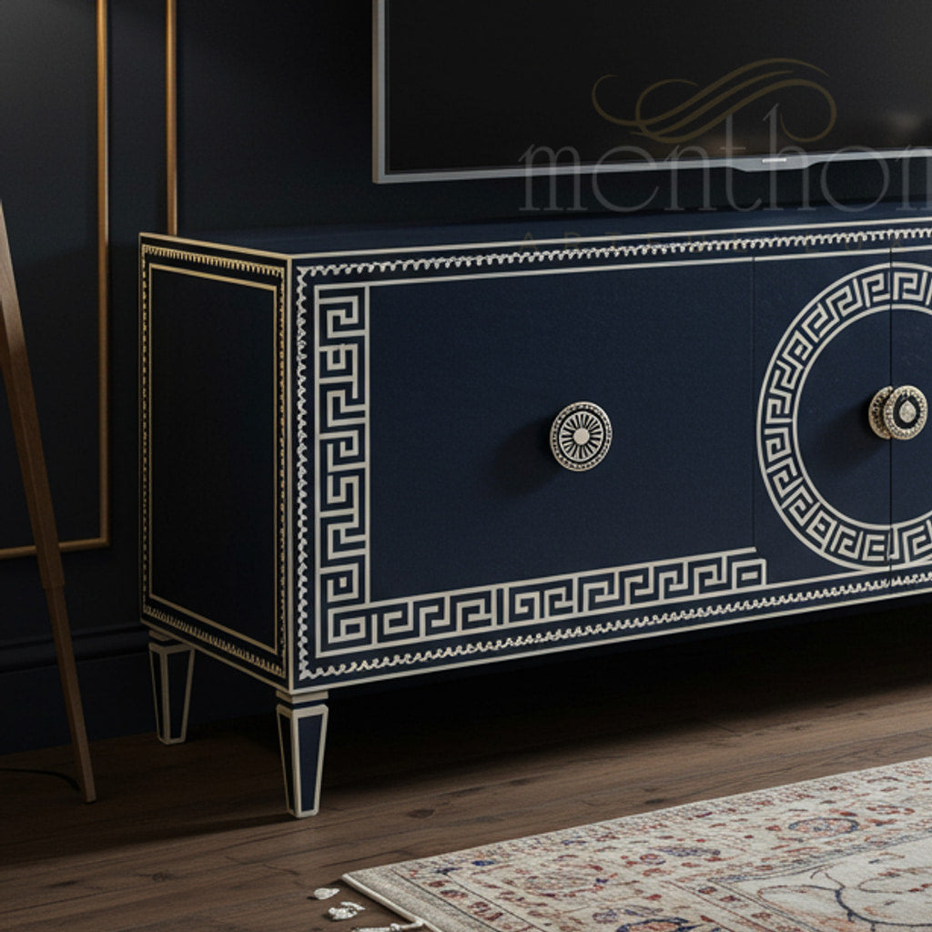 Elegantly crafted inlay TV cabinet featuring a distinctive Greek key motif in white on a deep navy blue finish. This luxurious piece combines classic design elements with modern functionality, offering ample storage behind stylish doors adorned with round, decorative knobs. The cabinet is elevated on slender, tapered legs, complementing the sophisticated look while fitting seamlessly into upscale living rooms.