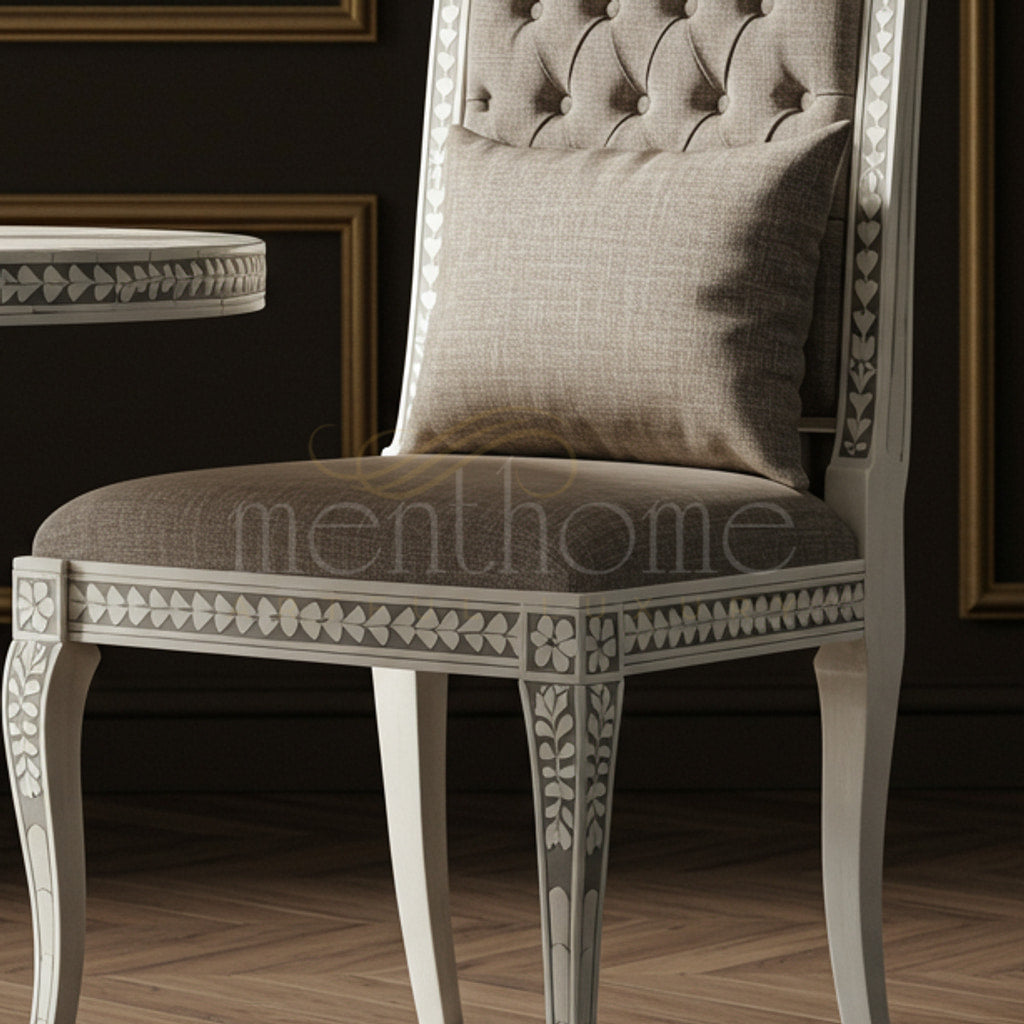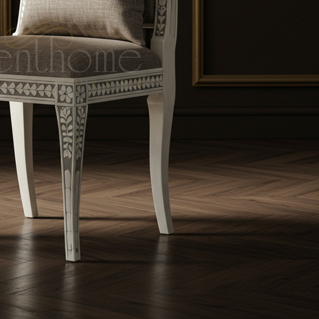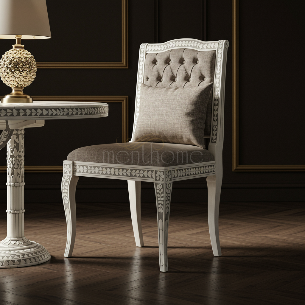 This elegant Inlay Chair features exquisite hand-crafted bone inlay work on a pristine white wooden frame, paired with a soft taupe upholstered seat and backrest cushion. The chair seamlessly blends traditional Indian craftsmanship with modern comfort, making it a statement piece for any high-end living or dining space.
