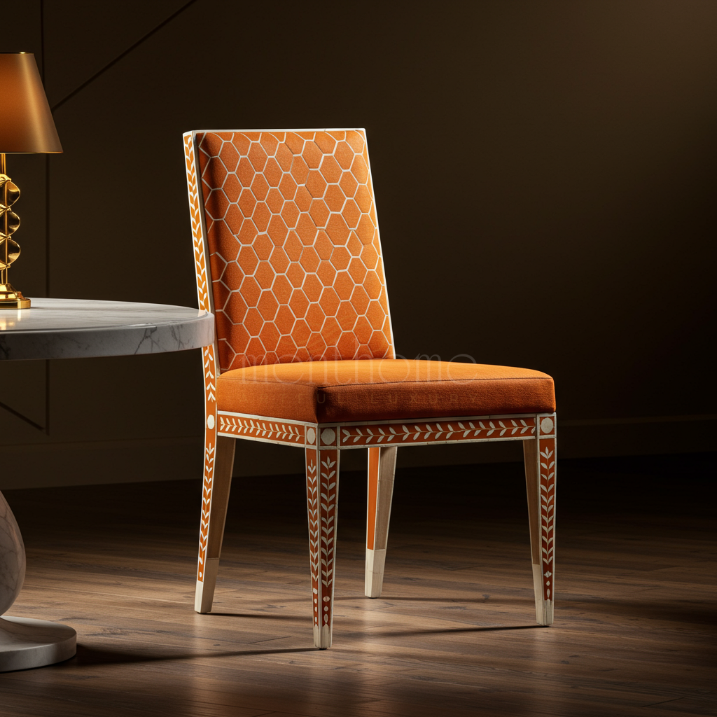 This exquisite Inlay Chair combines artisanal craftsmanship with modern elegance. Upholstered in a rich terracotta fabric with subtle geometric patterns, the chair features intricate white inlay detailing on its slender wooden frame, making it a perfect statement piece for sophisticated interiors.