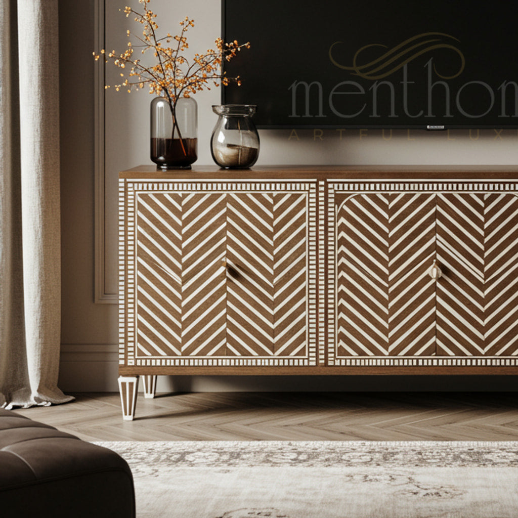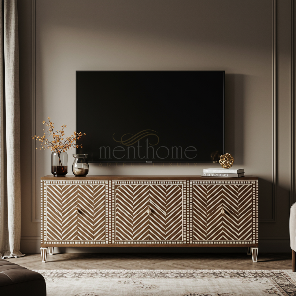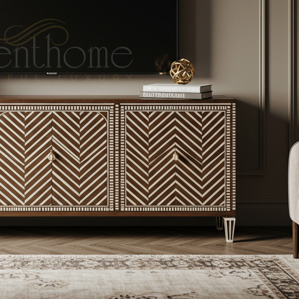 Luxury Inlay Wooden TV Cabinet with Geometric Pattern | Luxury Handmade TV Cabinet