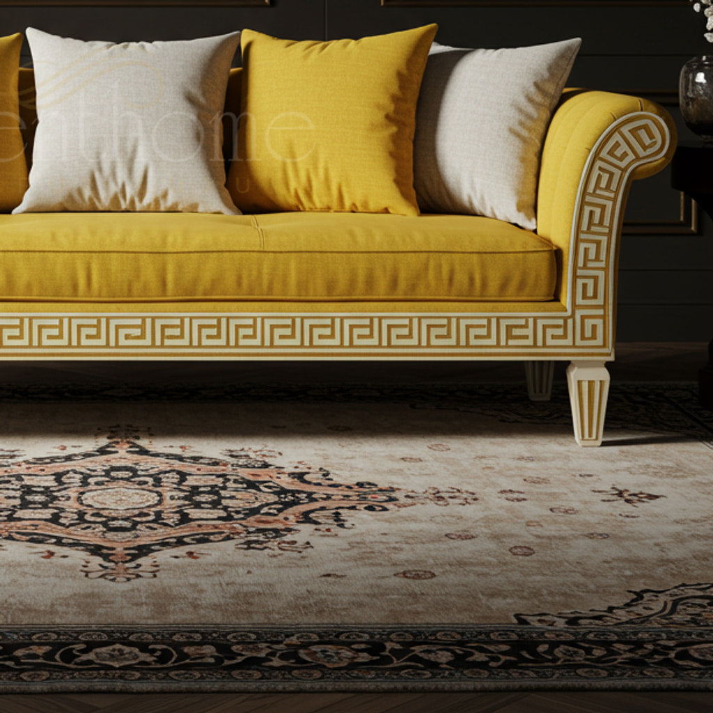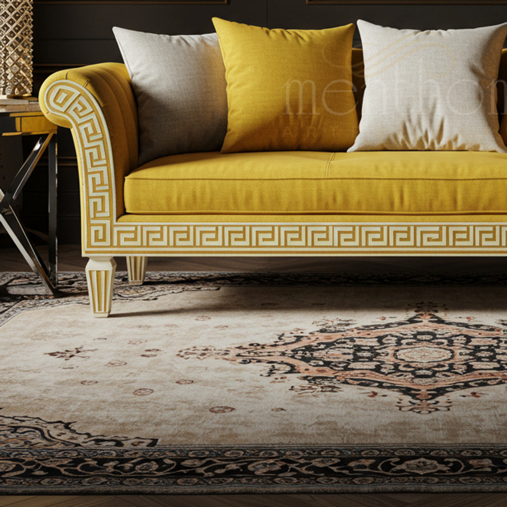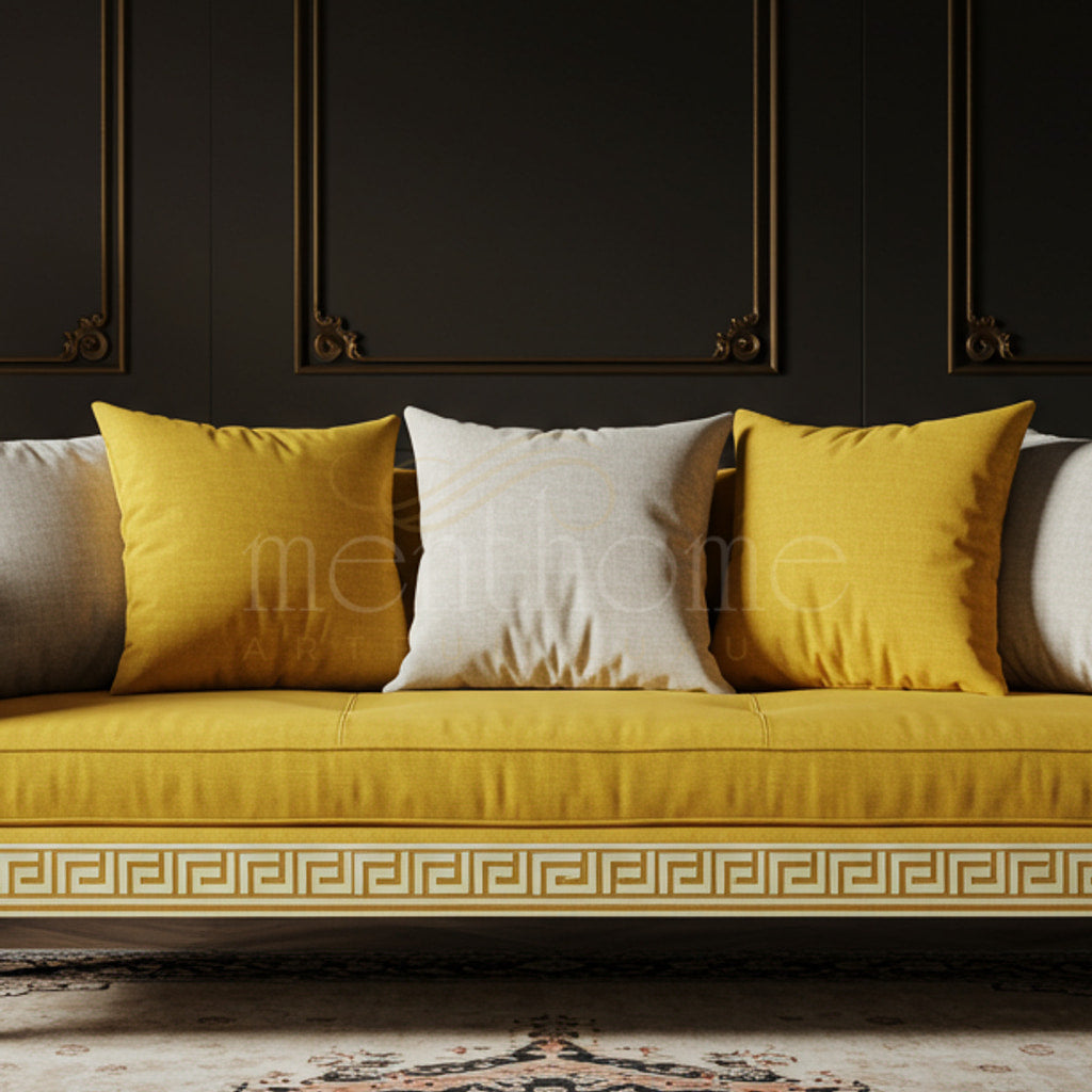 Luxury Inlay Yellow Velvet Sofa with Classical Greek Key Detailing | Luxury Handmade Sofa