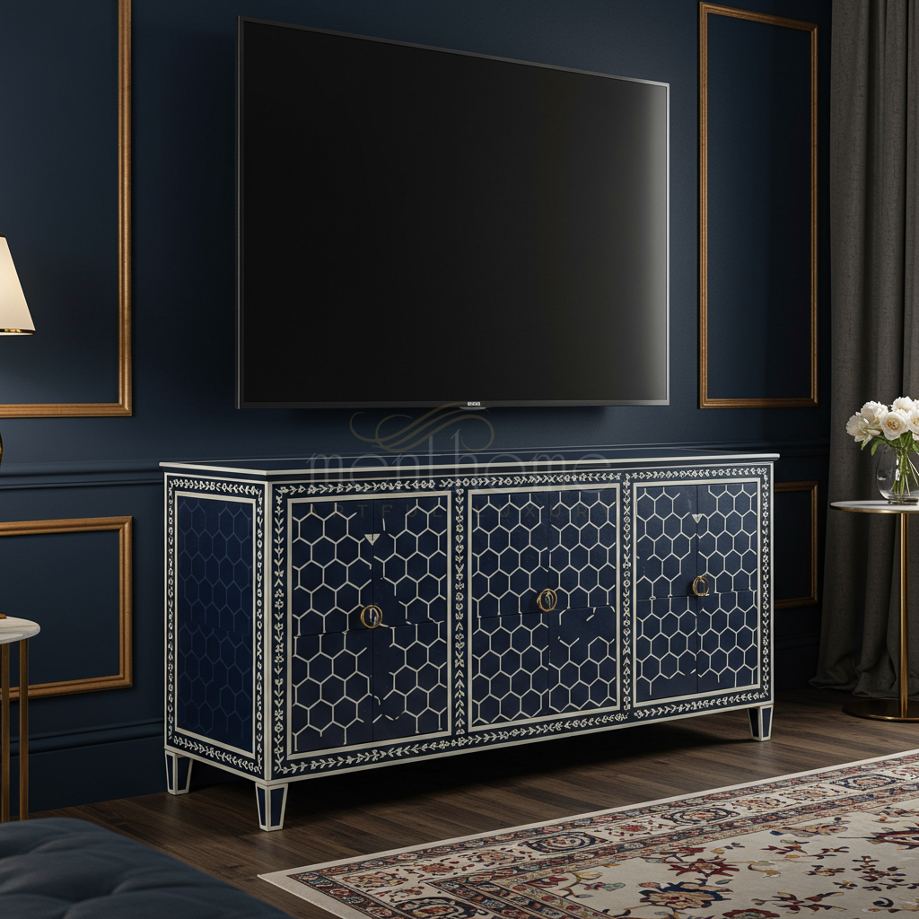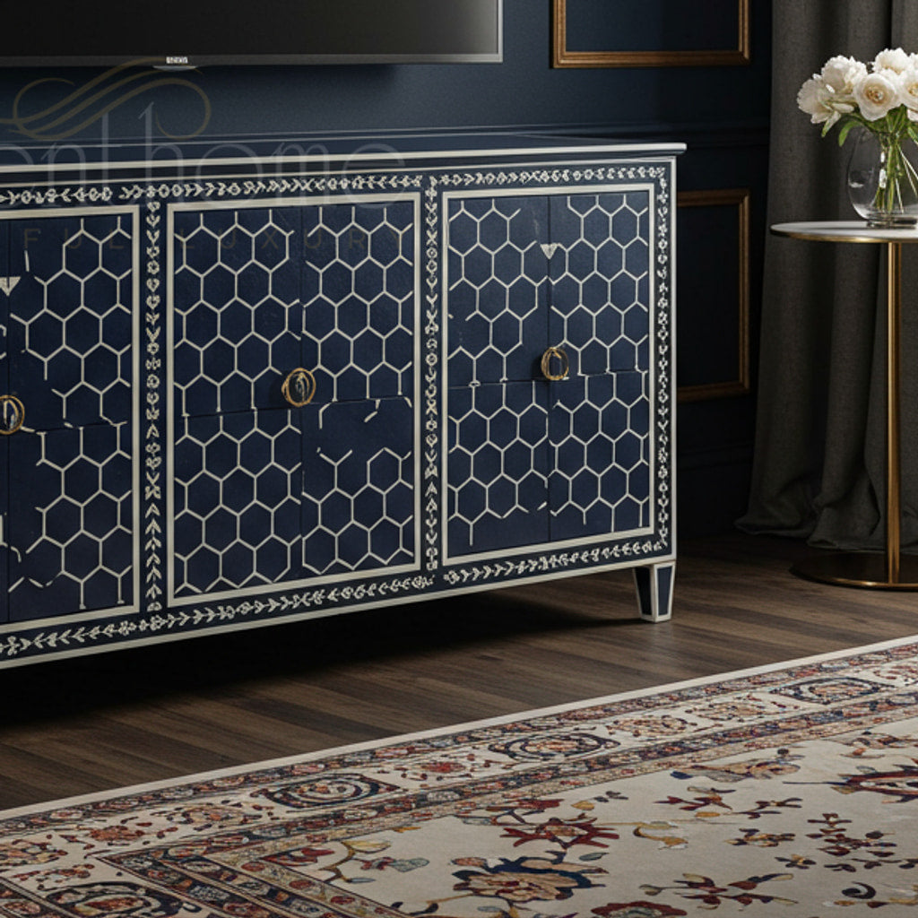 This exquisite navy blue TV cabinet features intricate white inlay work in a captivating geometric hexagonal pattern. Crafted with meticulous attention to detail, this piece combines refined elegance with functional storage solutions. Its high-gloss finish and gold-toned ring handles elevate any living room setting, placing it as a statement piece beneath your television.