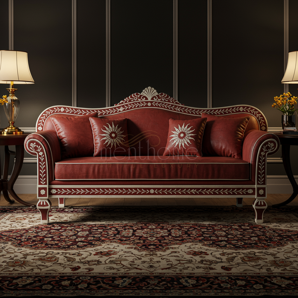 Experience timeless elegance with this exquisitely crafted inlay sofa that features rich red leather upholstery and intricate white floral inlay designs. Perfectly blending artistry with comfort, this sofa adds a regal touch to any living room or study. The beautifully curved backrest and armrests, along with the complementary embroidered cushions, highlight its artisanal craftsmanship.
