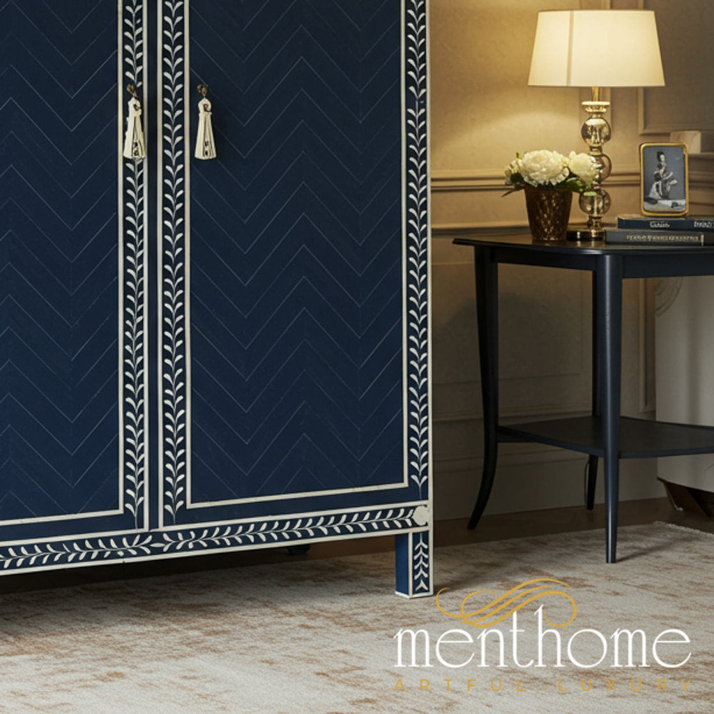 A beautifully crafted navy blue wardrobe featuring intricate white bone inlay designs with elegant tassel handles. Perfect for stylish storage in bedrooms or living spaces.
