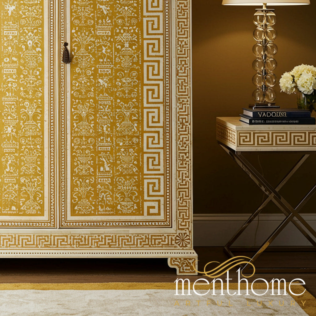 A stunning hand-painted armoire featuring intricate Greek Revival patterns in gold and white. This elegant storage piece offers both beauty and functionality, perfect for adding a classic touch to your living space.