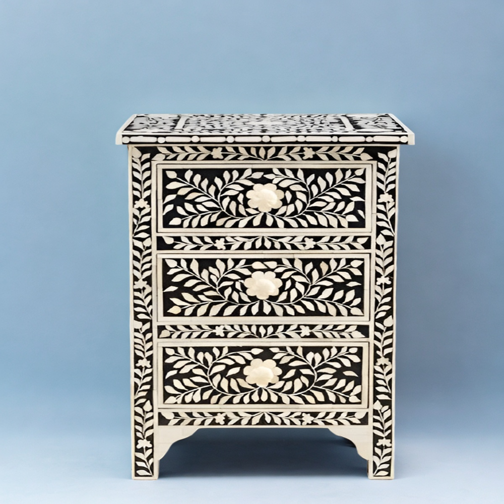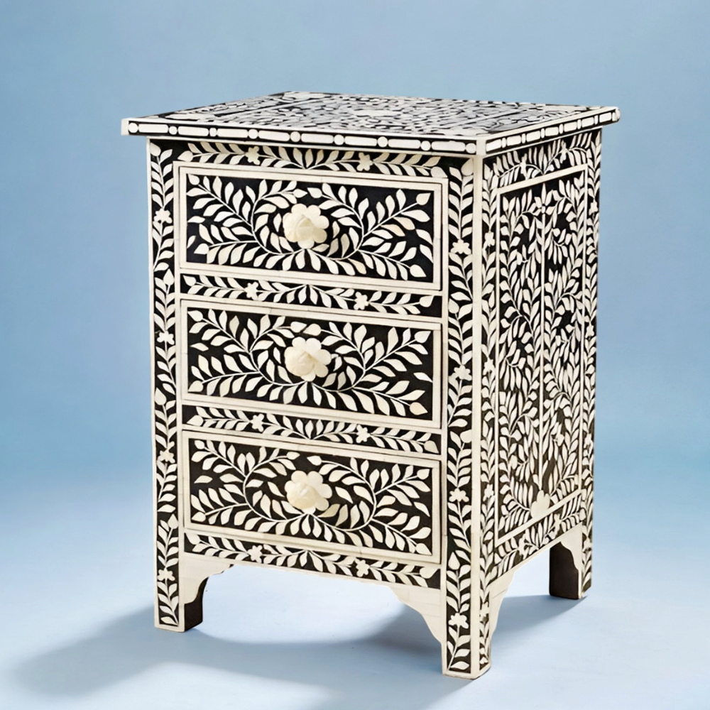 Add a touch of timeless beauty to your bedroom with our Resin Floral Bedside Table in Black Bone Inlay. Handcrafted with intricate floral designs, this exquisite piece brings sophistication and elegance to any space. Explore luxury and charm with our artisanal creation today. \n