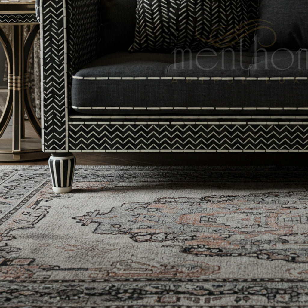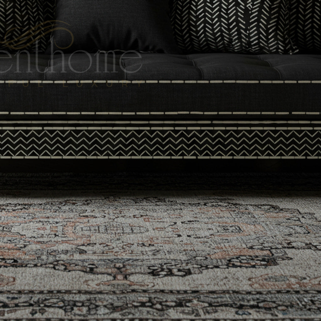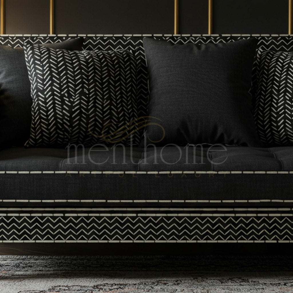 Sophisticated Black Inlay Sofa with Patterned Upholstery | Luxury Handmade Sofa